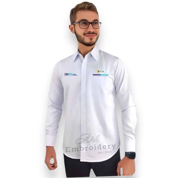 Kemeja Seragam PLN lengan Pendek-Panjang , full bordir Pria - wanita Navy Putih full Bordir Bahan