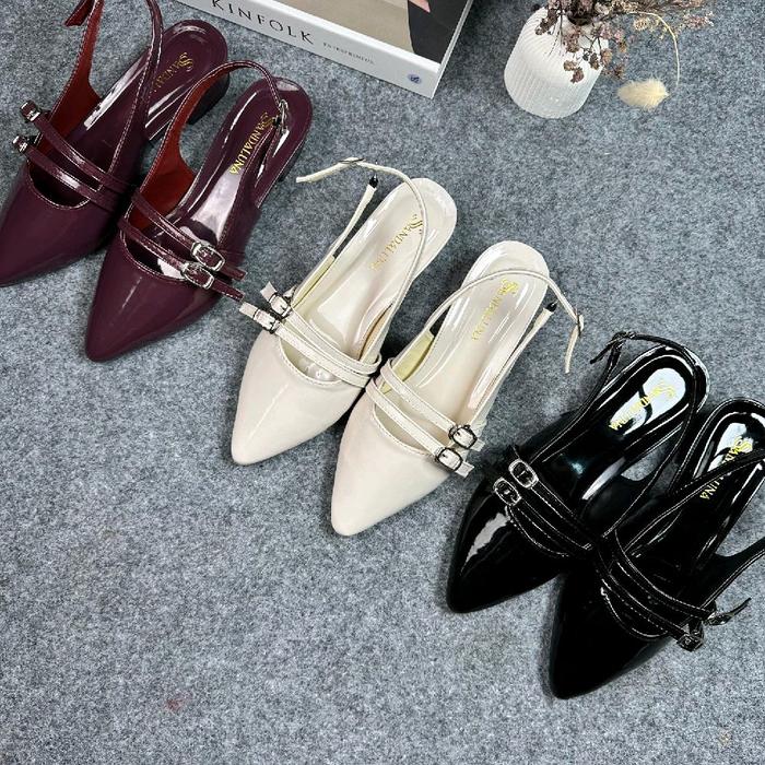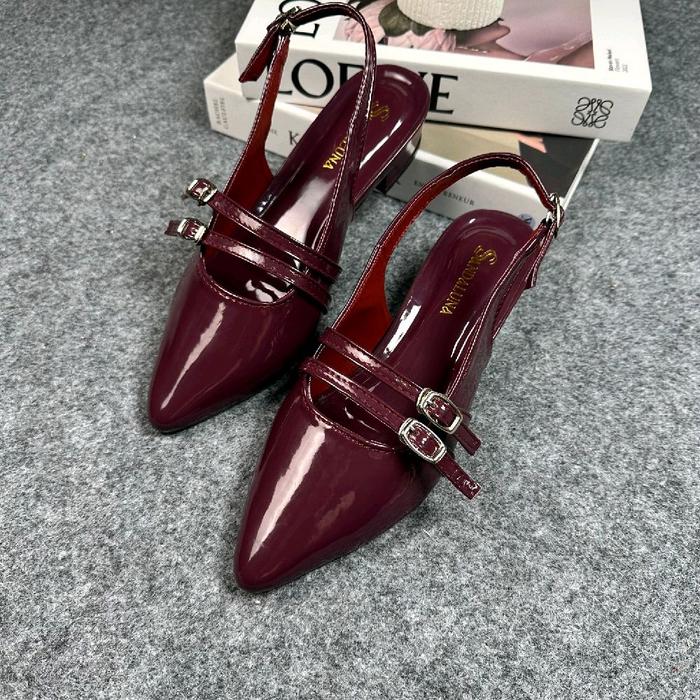 Sepatu Heels Wanita 3 cm Elegan Kekinian Terbaru Hak Tahu Sandal Mules Tali Gesper 2 Sepatu Pesta Pernikahan - Maroon 37
