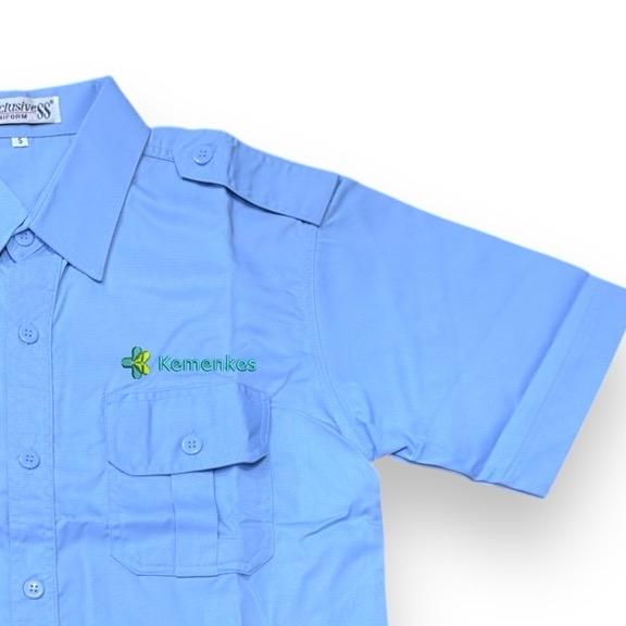 Kemeja Seragam Kemenkes RI Warna Biru Muda Pria-wanita Bahan American drill Lengan Panjang-Pendek