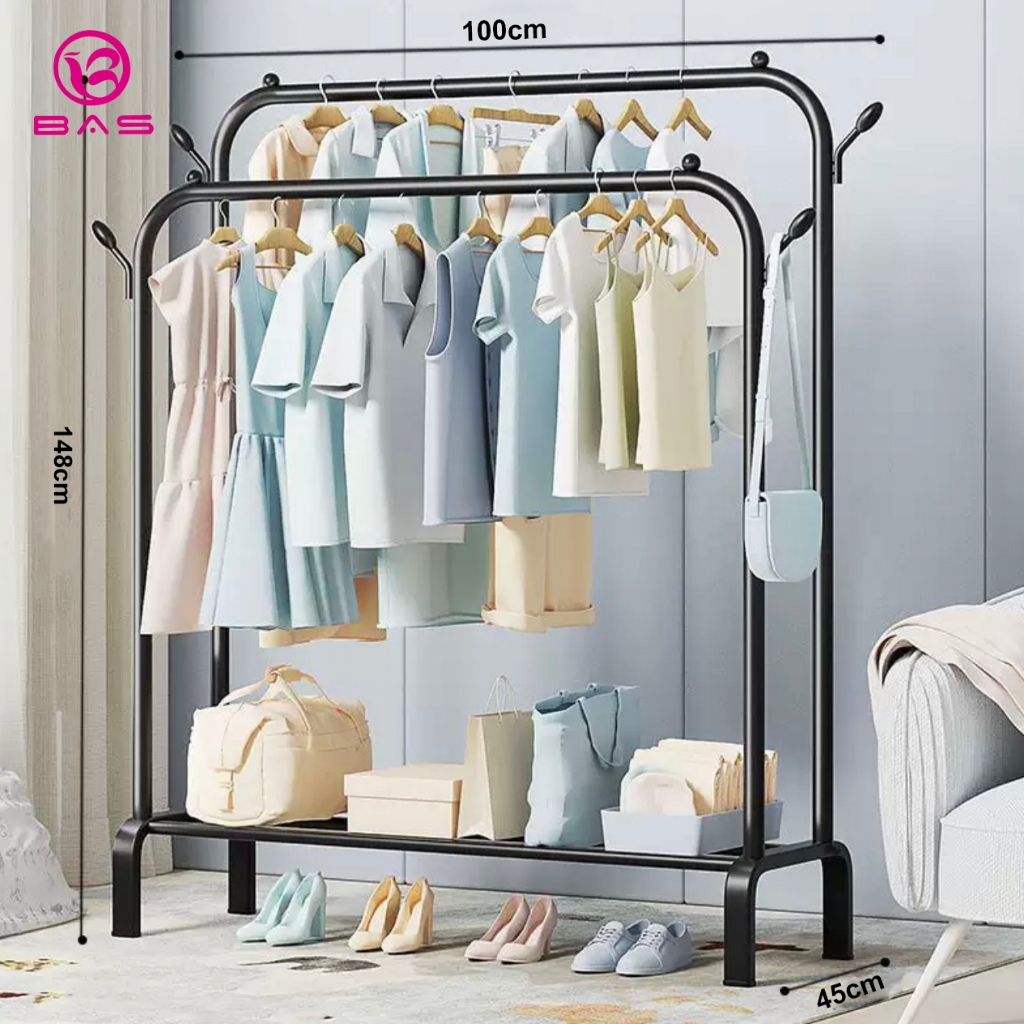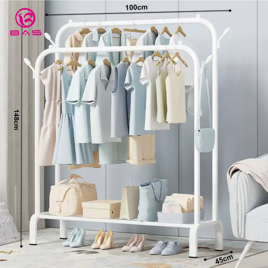 Bas Stand Hanger Double Rak Gantungan Baju Berdiri Tempat Pakaian Serbaguna