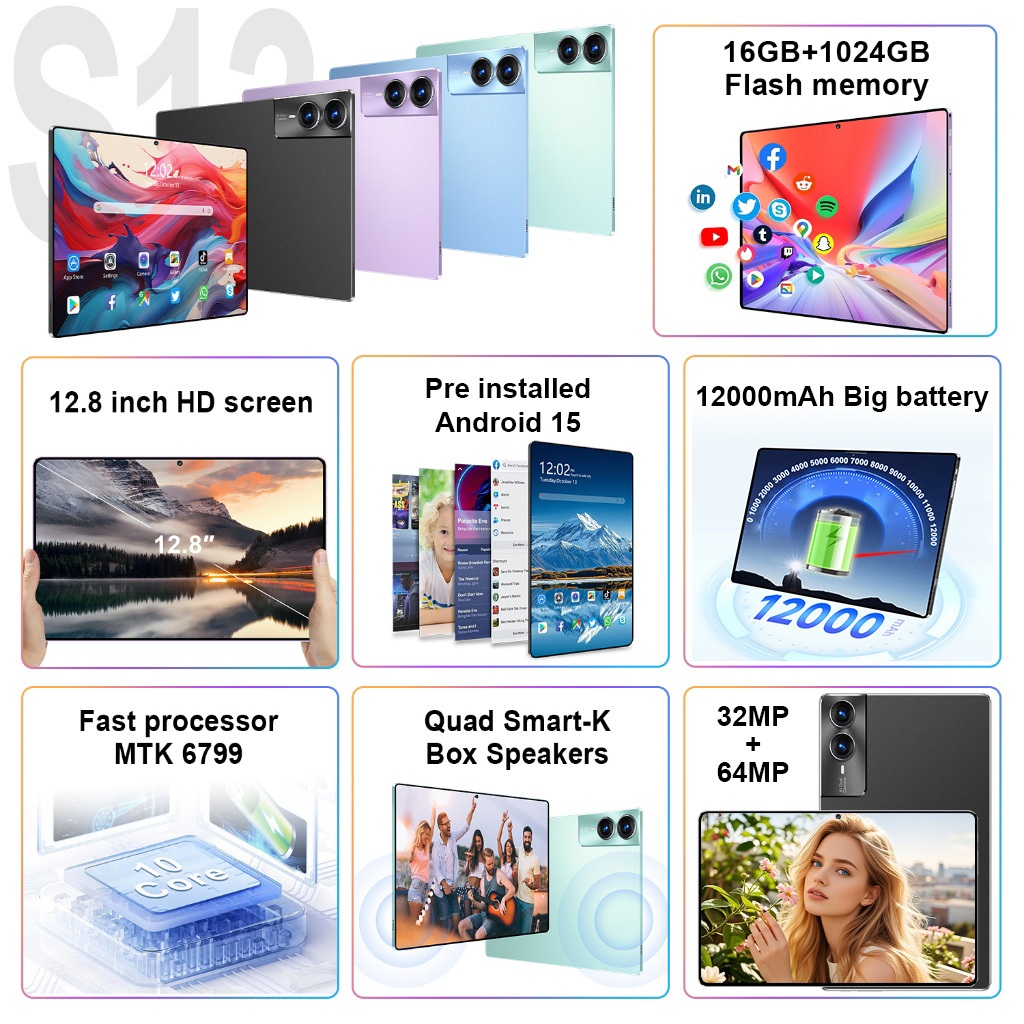 Tablet S13 12.8 Inch, RAM 16GB + 1024GB ROM, Android 15 , 5G Dual SIM, Wifi, Tablet PC untuk Belajar & Hiburan Layar besar 12,8 inci