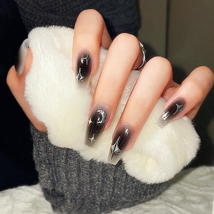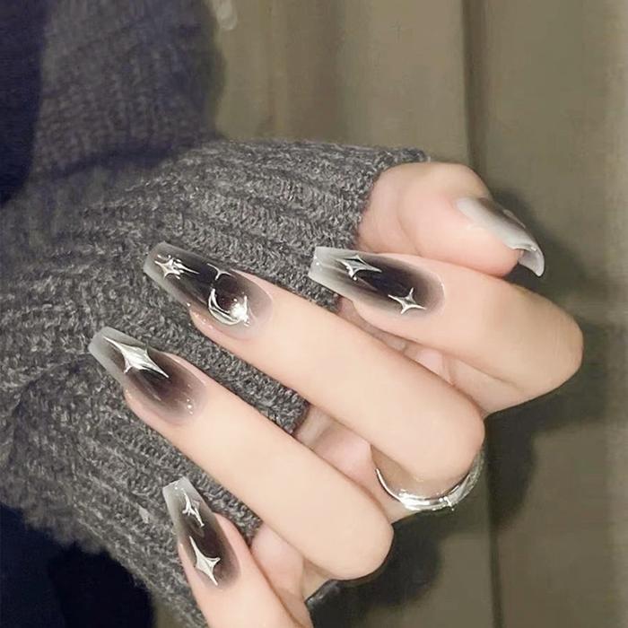 c06 Kuku Palsu nail art aesthetic dan lem wisuda 24pcs tangan cat Polish hitam - A722BCP