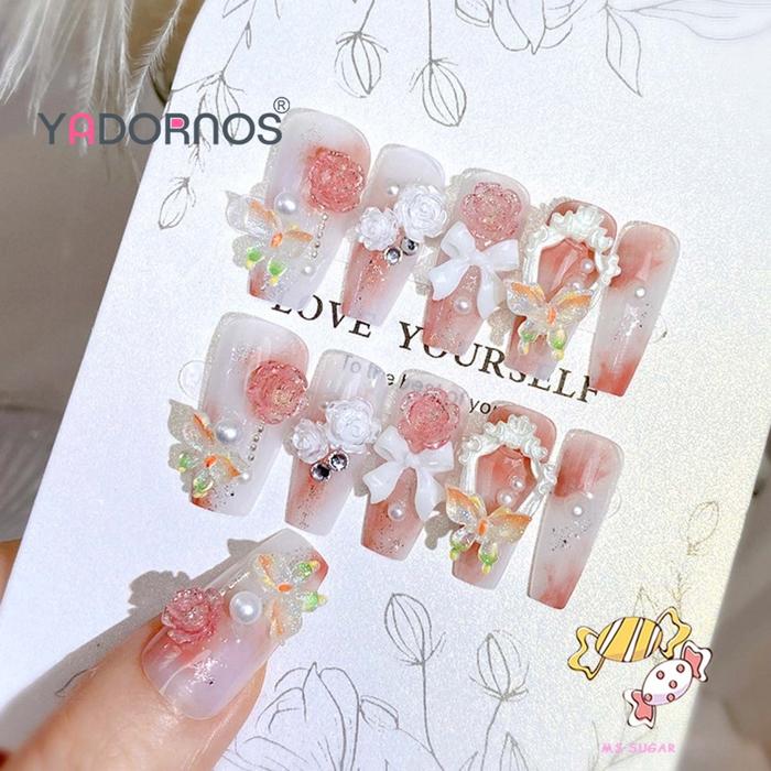 YADORNOS 24pcs Bow Camellia Patch Kuku Palsu - 3D Bow Nail Art - Handmade - Mudah Dihapus dan Digunakan