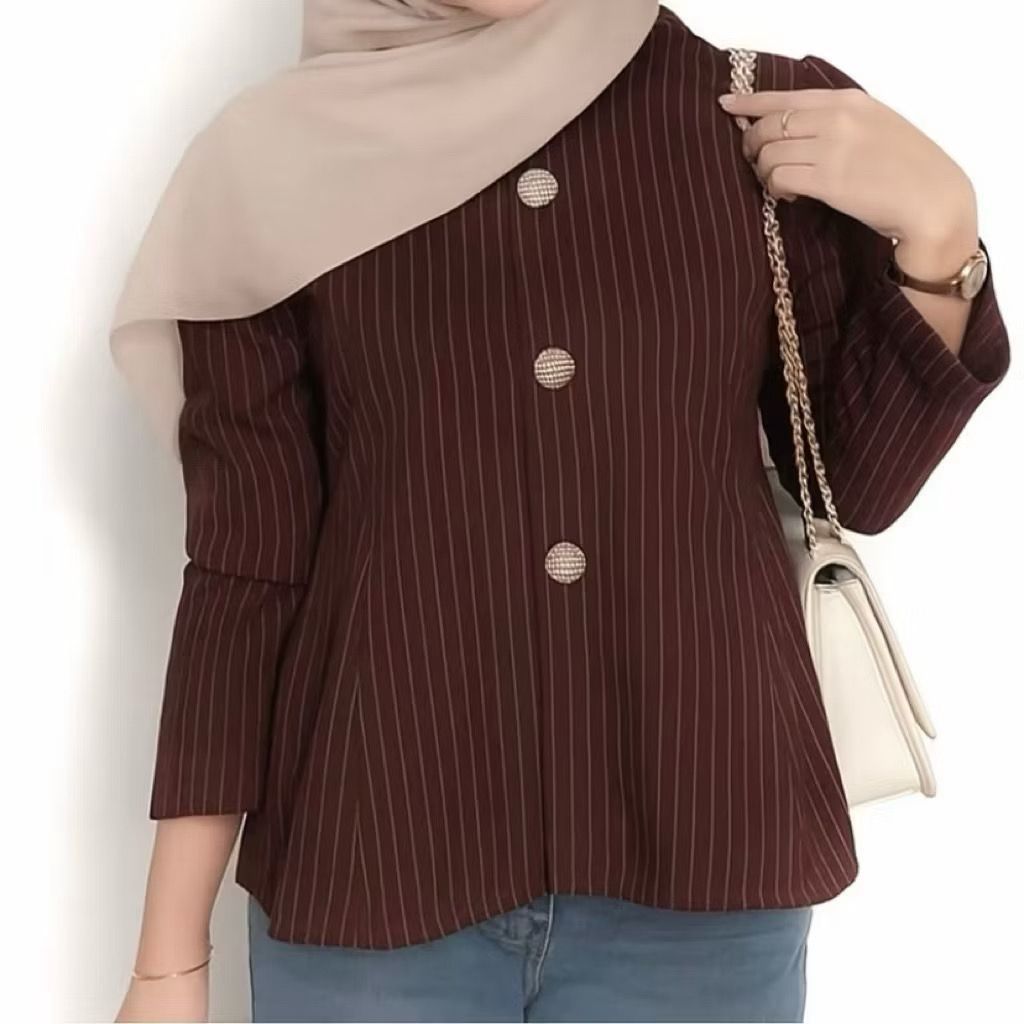 Elezza- Arika Blouse Stripe Atasan Wanita Peplum Lengan Panjang Puff Fit Body Fitted