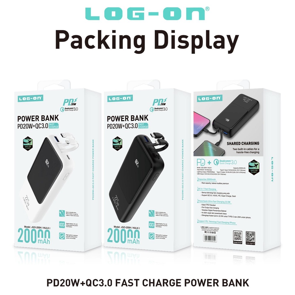 LOG ON POWERBANK 22.5W 20.000mAh PD+QC3.0 JGO-200H BUILT IN CABLE IPHONE, TYPE C FAST CHARGING