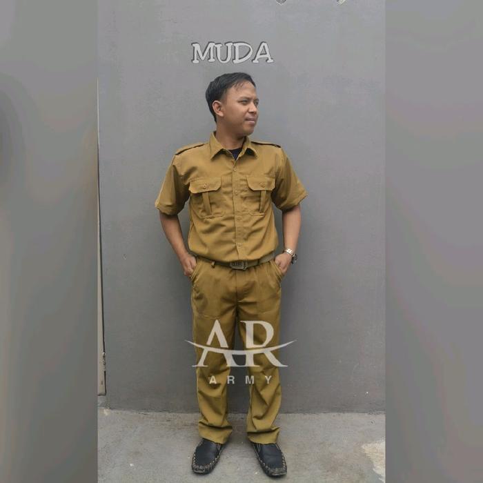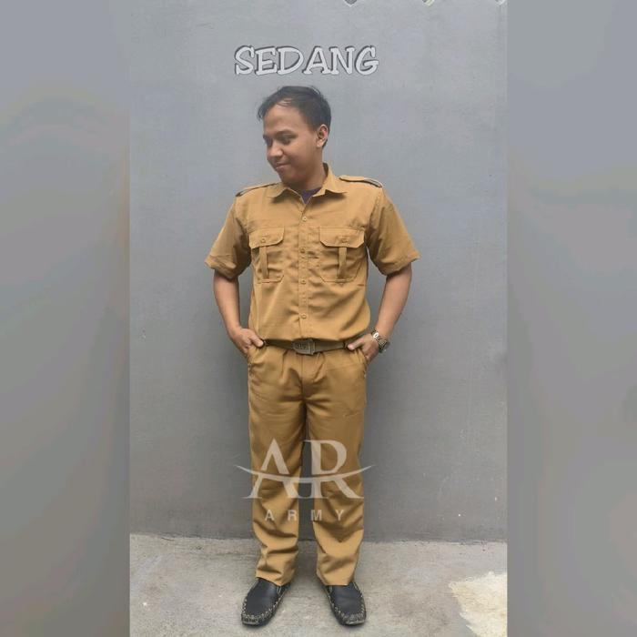 SERAGAM PNS ASN PEMDA PEMKOT GURU PRIA KHAKI MUDA SEDANG TUA BAJU DAN CELANA PANJANG KATUN LEMBUT SETELAN KERJA LENGAN PENDEK UKURAN S-4XL - KHAKI MUDA, S