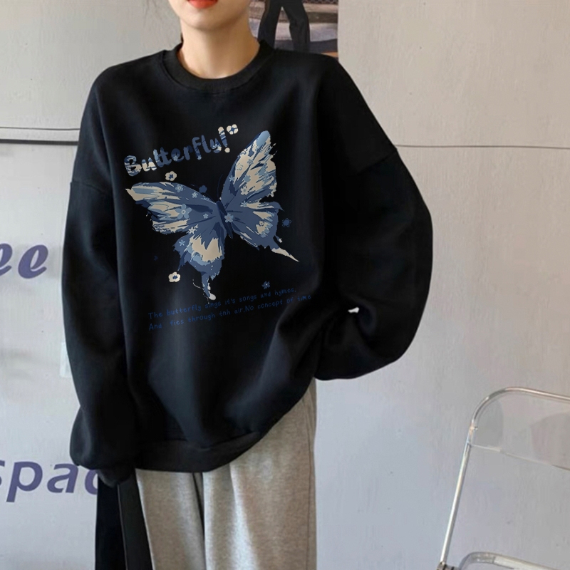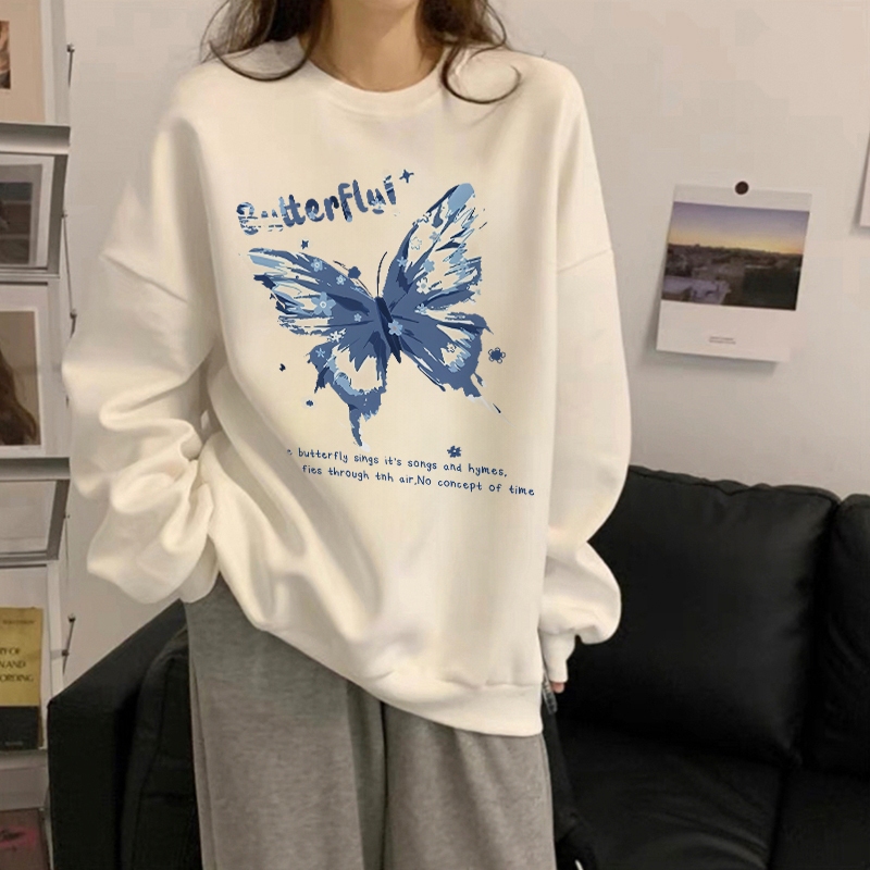 Forteid Sweater Lengan Panjang Oversized Street Style Korean Style/Switer Wanita Oversizecetakan Cetakan Kupu-Kupu Mode