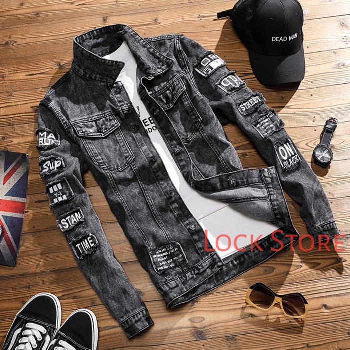 Jaket Jeans Pria dengan Motif Emblem Lengan Bordir dan Warna Kalem Pria Slim Fit - Putih Bordir S