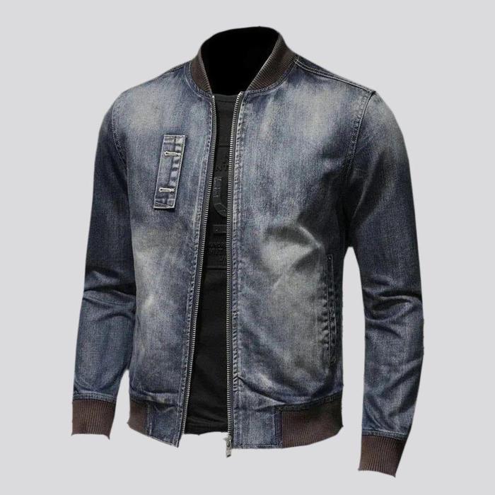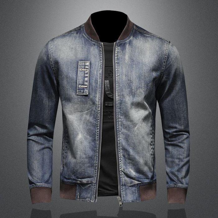 MAMIMA-jaket jeans pria model boomber bahan denim kerah rip polosan resleting santai atasan cowok - blue M