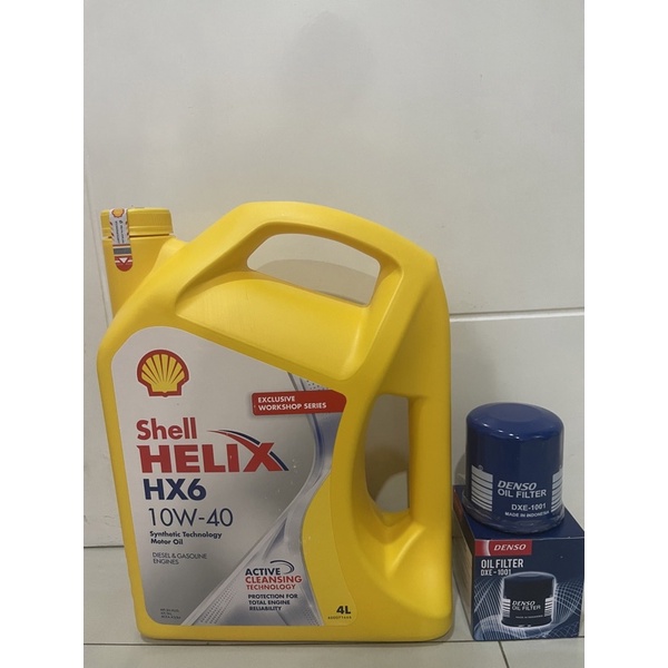 Paket Shell HX6 10w-40 4liter dan filter OLI Denso dxe-1001 untuk mobil avanza,xenia,granmax,luxio,agya,sigra,terios,rus