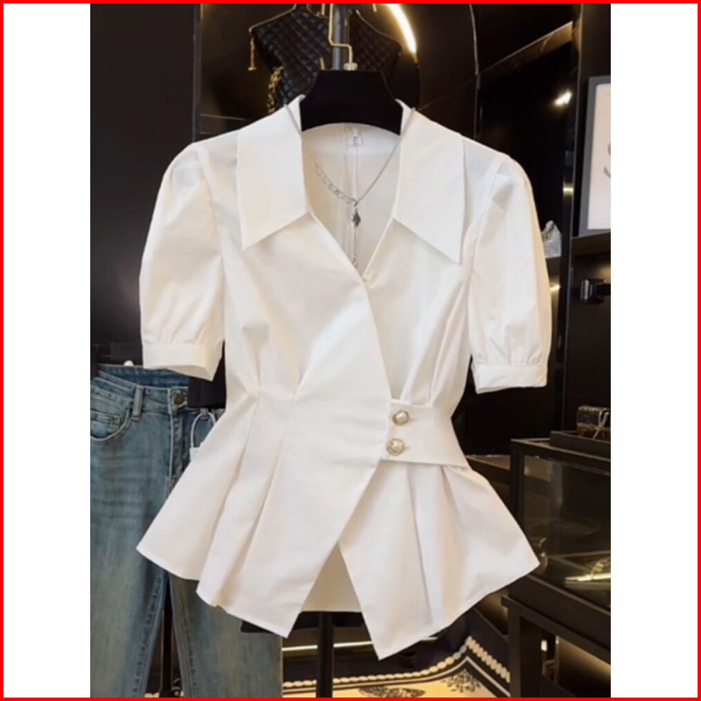 Ready Stock Atasan Kemeja Elegan Lengan Pendek Dengan Kerah V-neck Dan Model Ramping