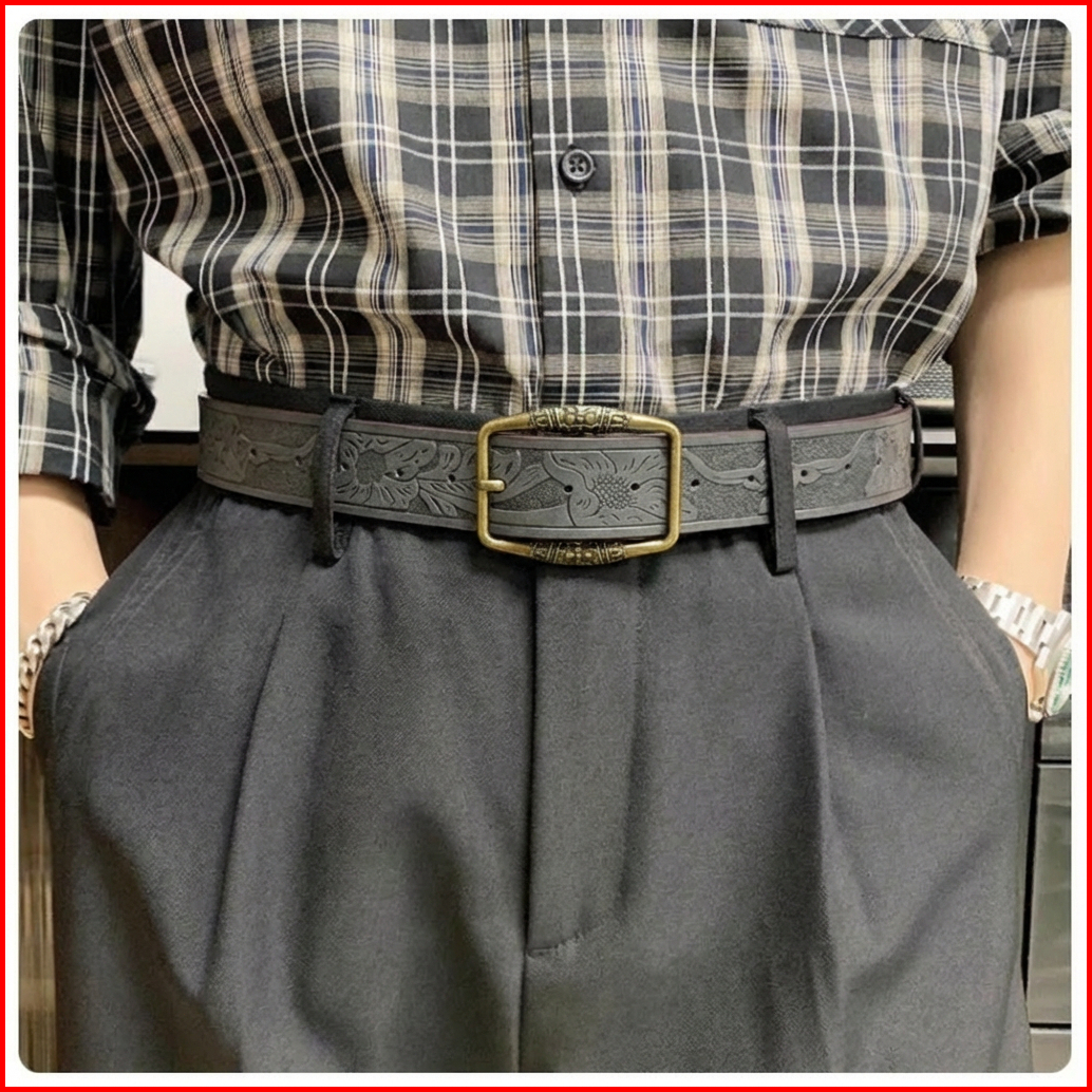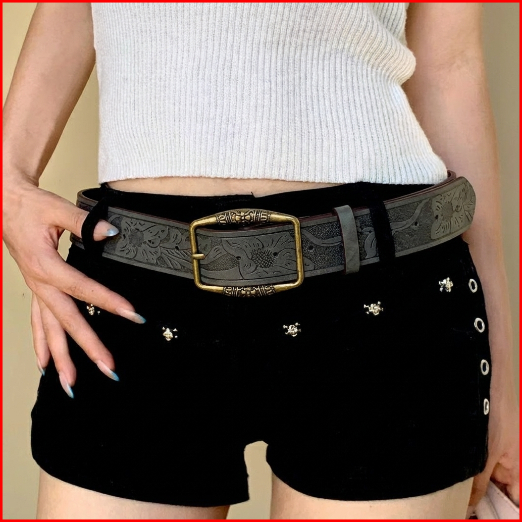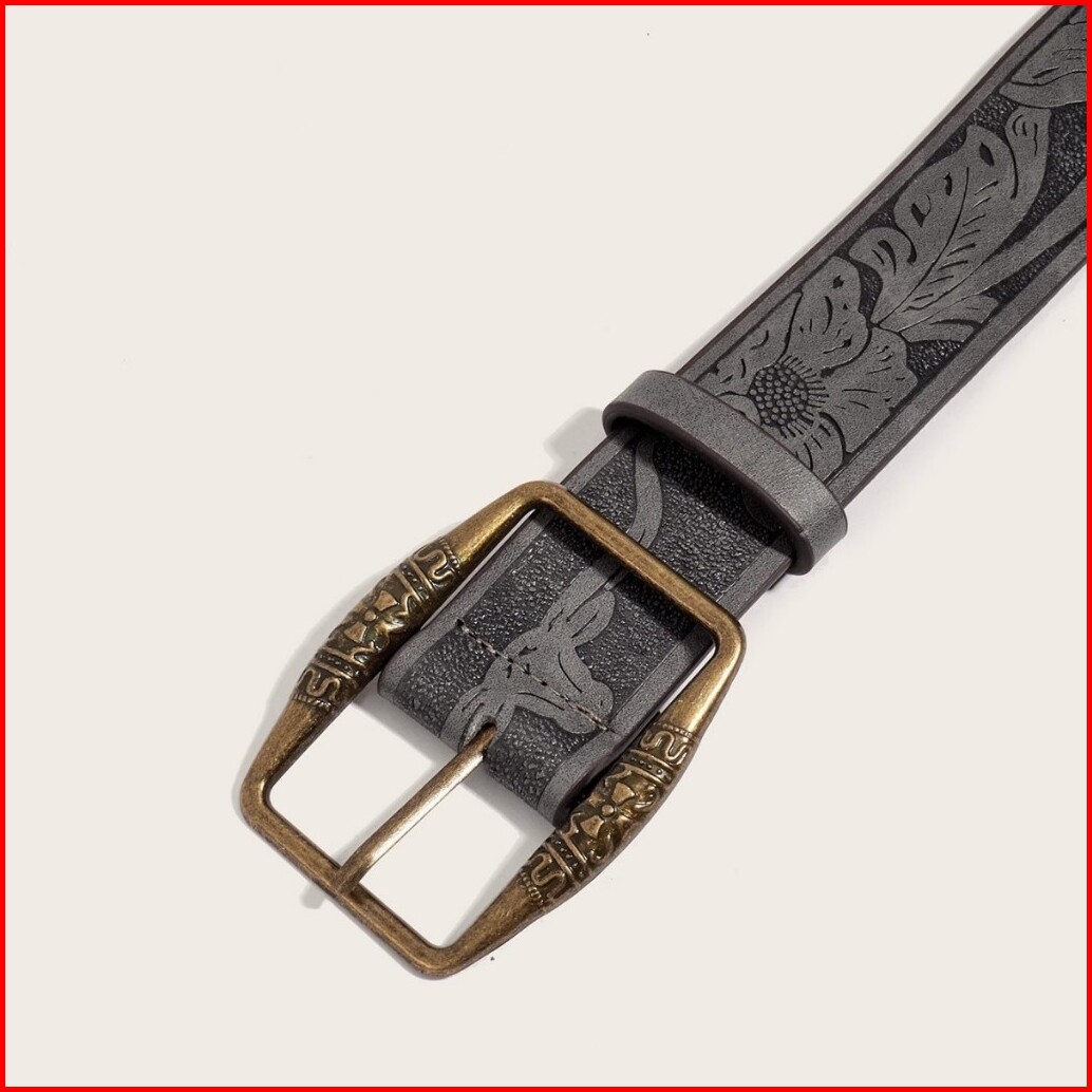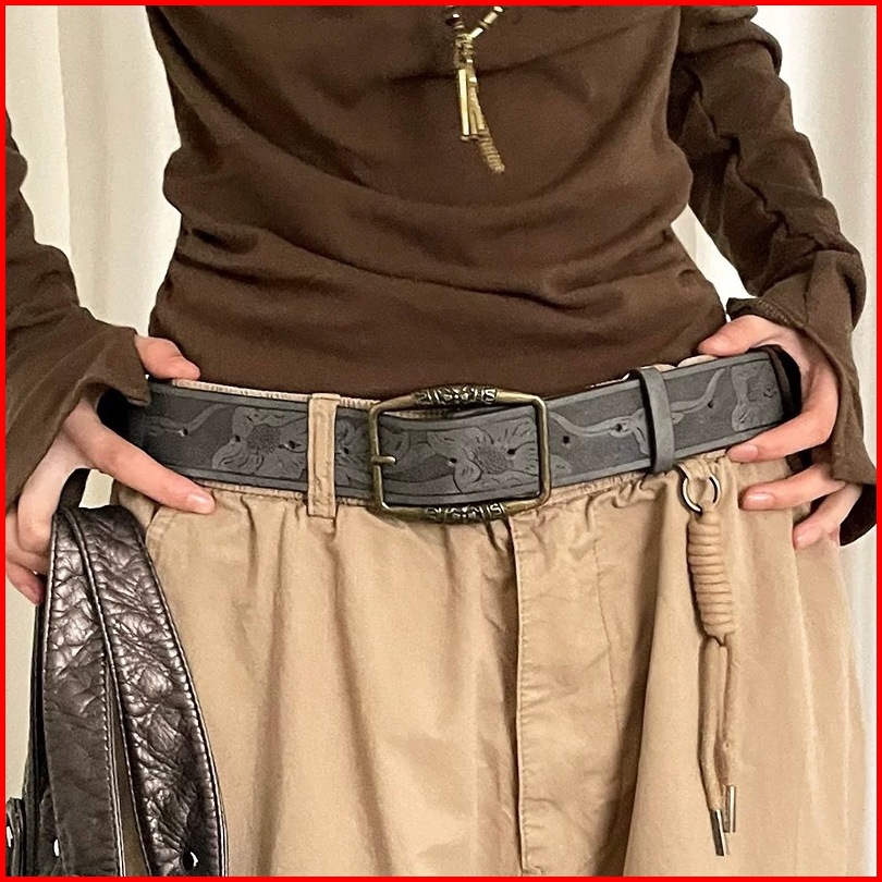 Ikat Pinggang Wanita Kulit Pu Kancing Logam Retro Stylish Sabuk Amerika Vintage Etnik Fashion Belt Abu Abu Kekinian Untu