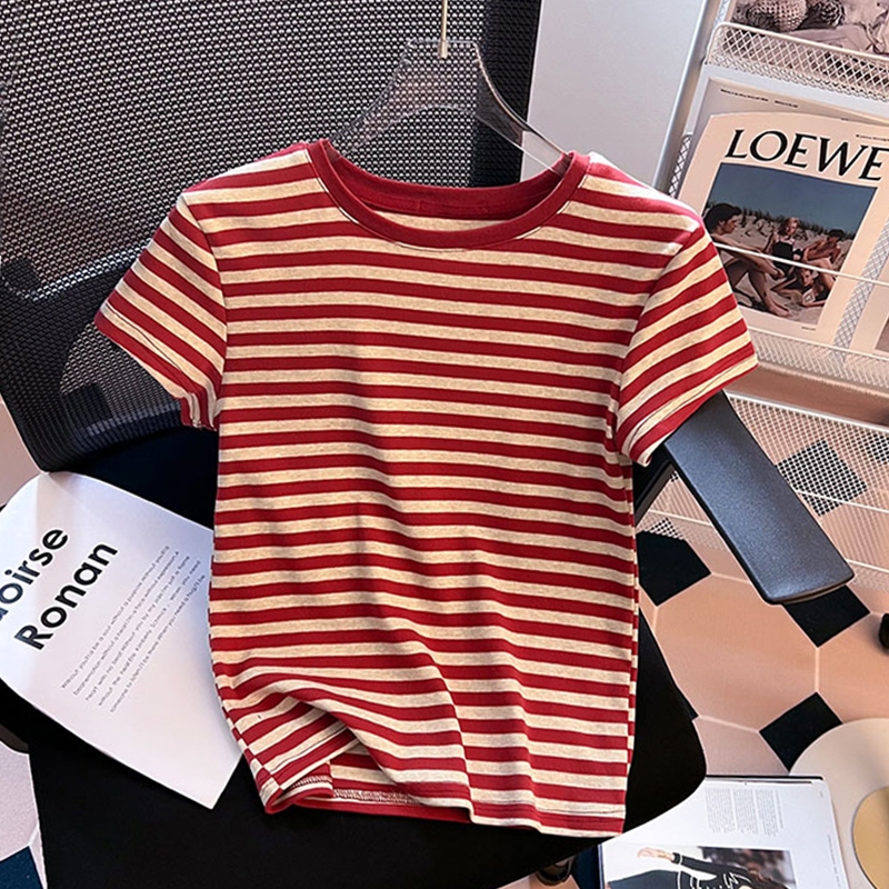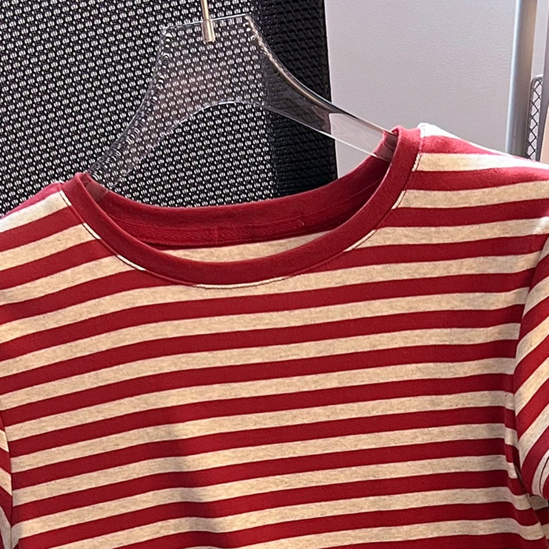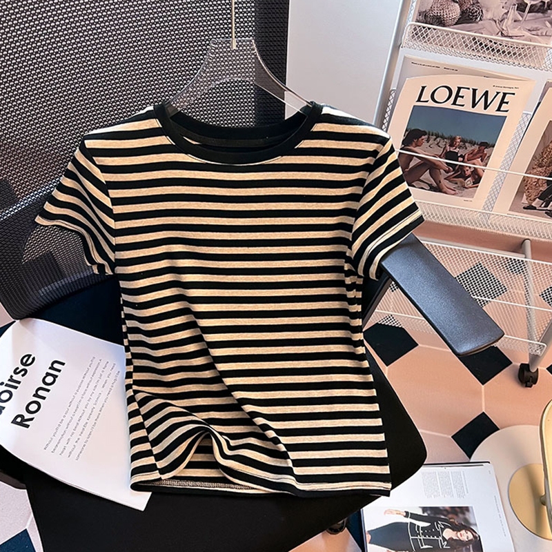 Kaos Leher Bulat Bergaris Warna Kontras Terbaru Atasan Ketat Seksi Fashion Wanita Gaya Korea