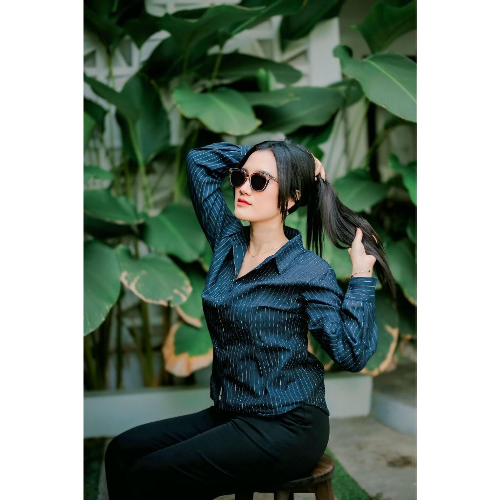 Kemeja Fitted Wanita Stripe Salur Basic Casual Maroon