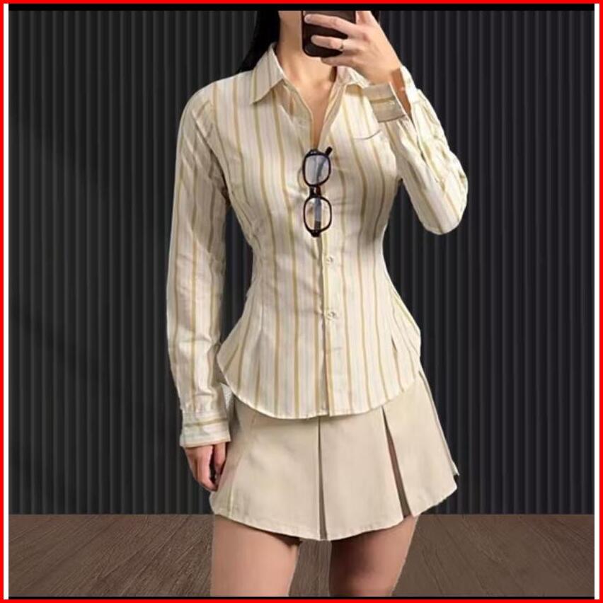 Laora Fitted Shirt Atasan Wanita Slim Fit Body Lengan Panjang Kemeja Kerja Motif Salur