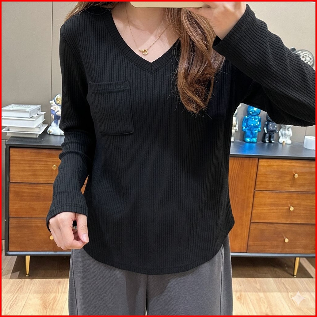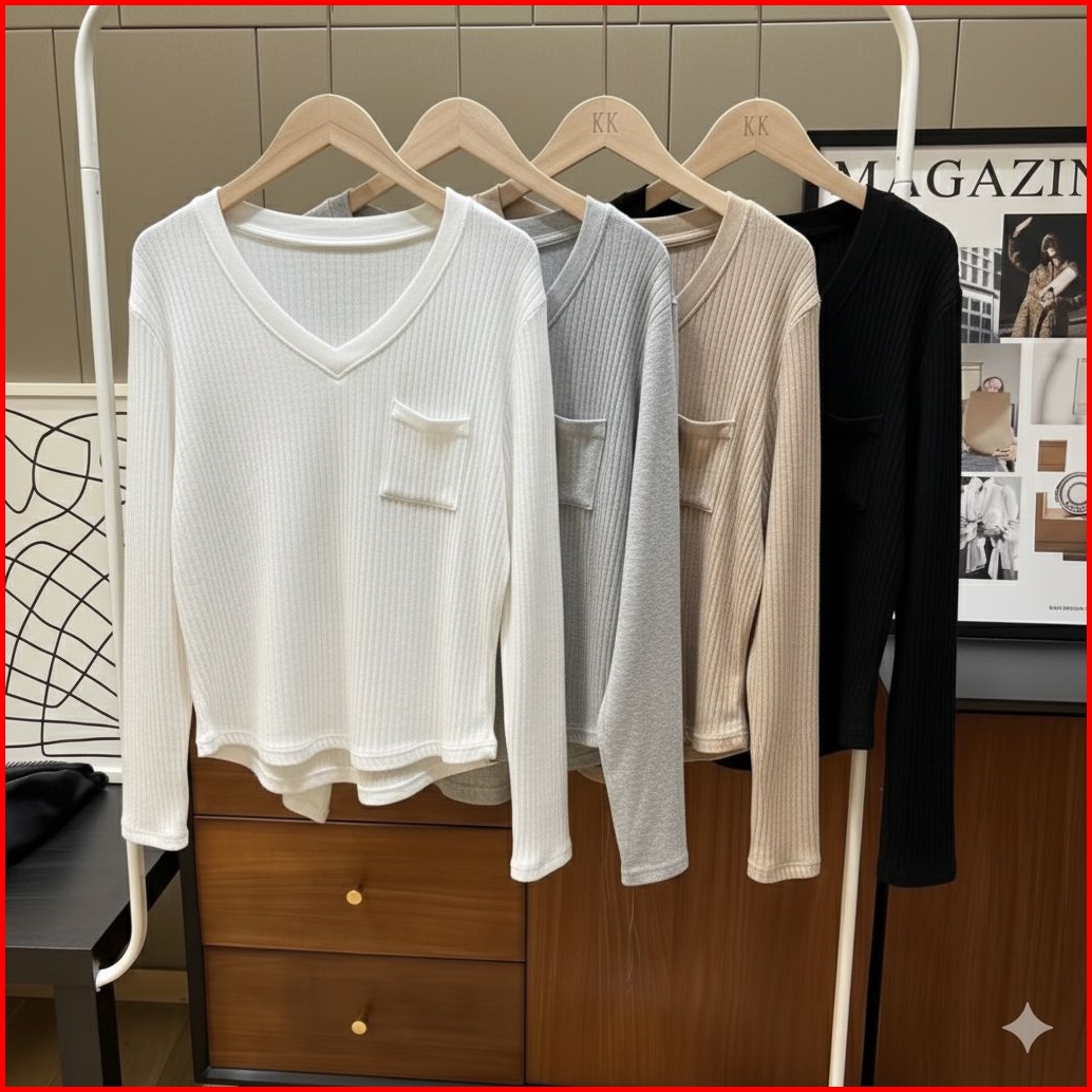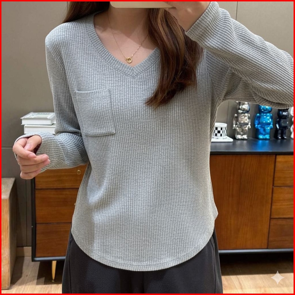 Kaus Rajut Lengan Panjang Wanita V-neck Polos Knit Rib Korea Atasan Wanita V-neck Lengan Panjang Knit Rib Premium Korean