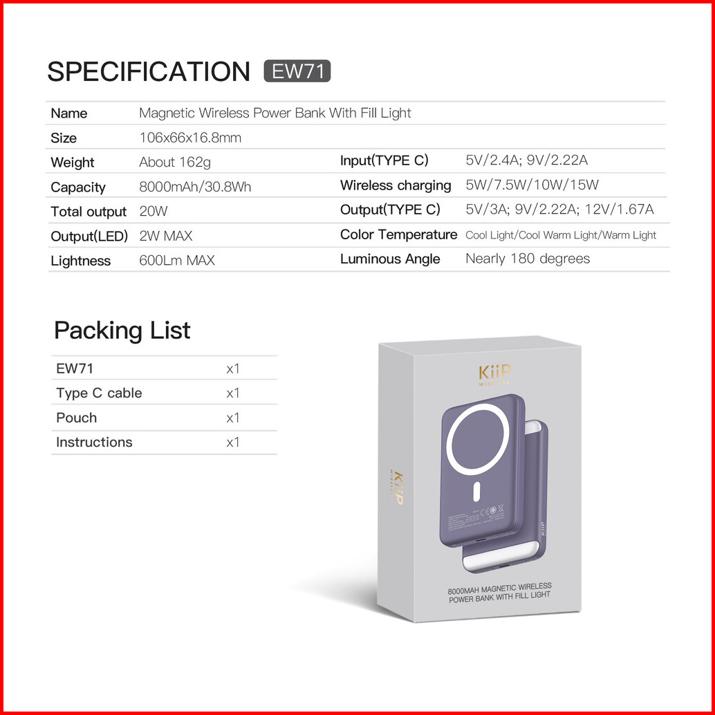 Kiip Wireless Ew71 Powerbank Dual Magnetic Fill Light Fast Charge 20w