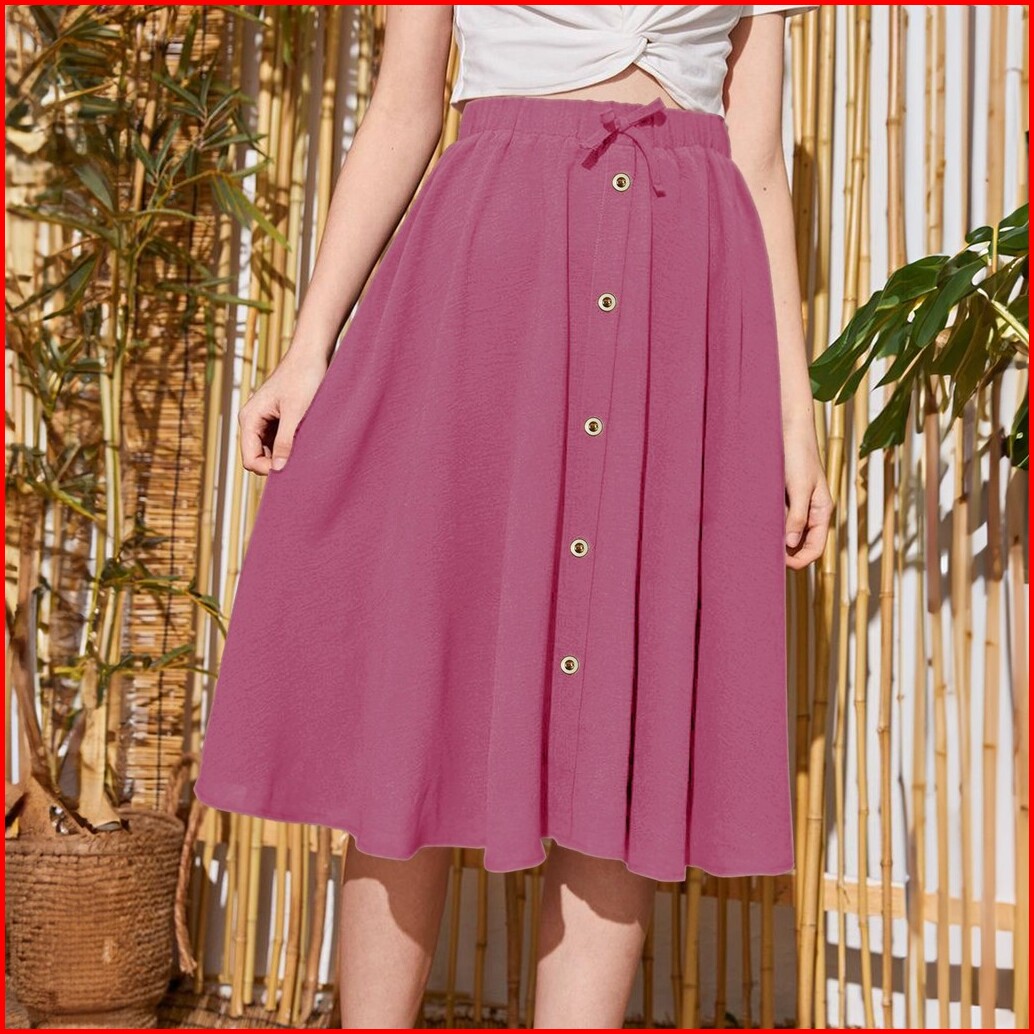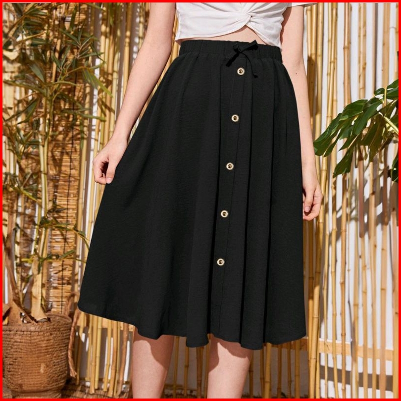 Rok Midi Wanita Selutut Pita Korea Style Terbaru Bahan Crinkle Jatuh Dan Nyaman Digunakan Hiasan Kancing Hitam A-line Ca