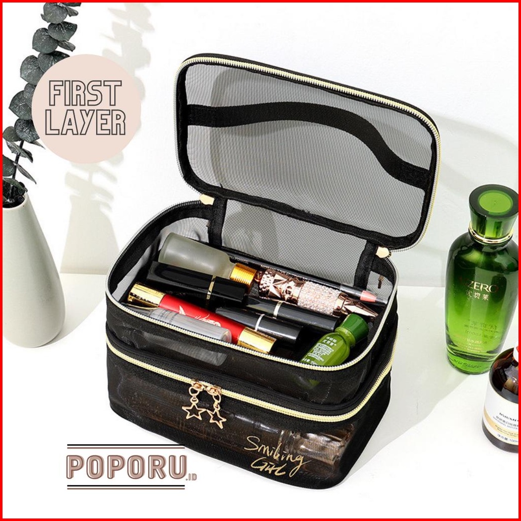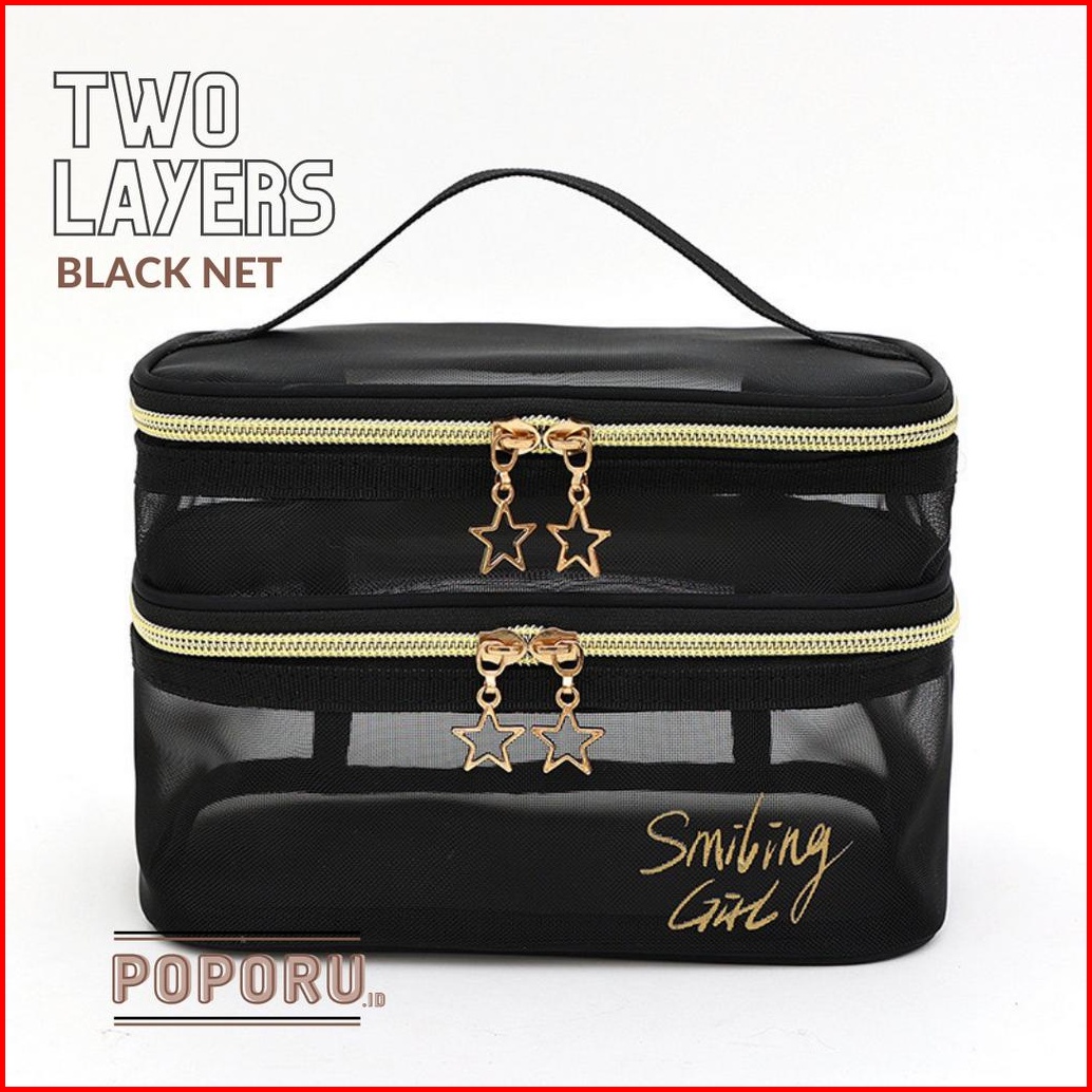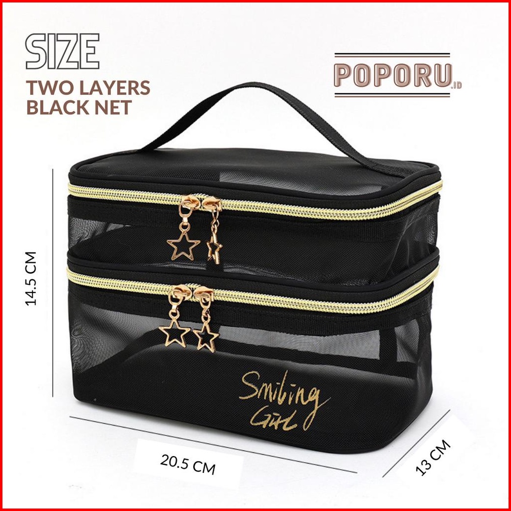 Poporu Two Layers Black Net Pouch - Travel Cosmetics Bag Organizer For Make Up - Tas Tempat Kosmetik