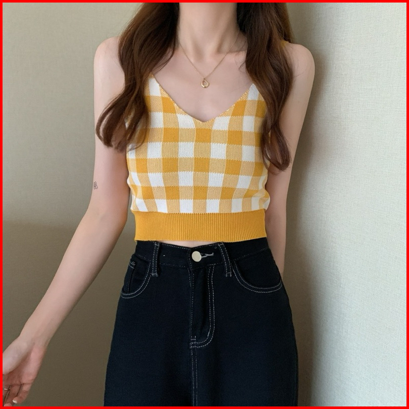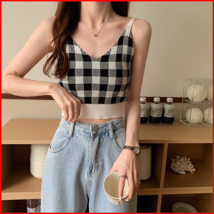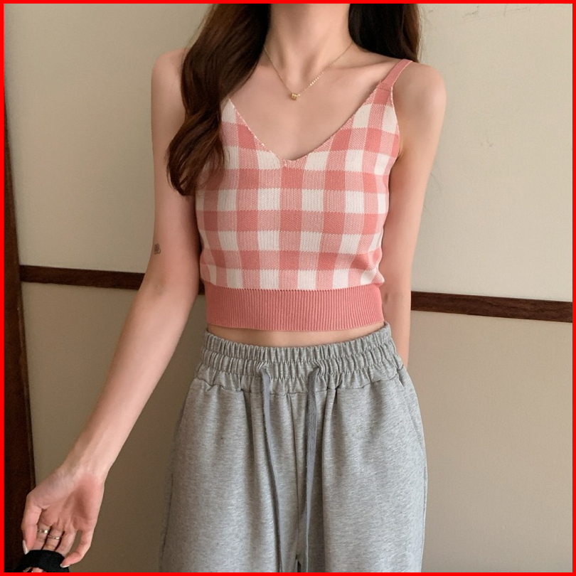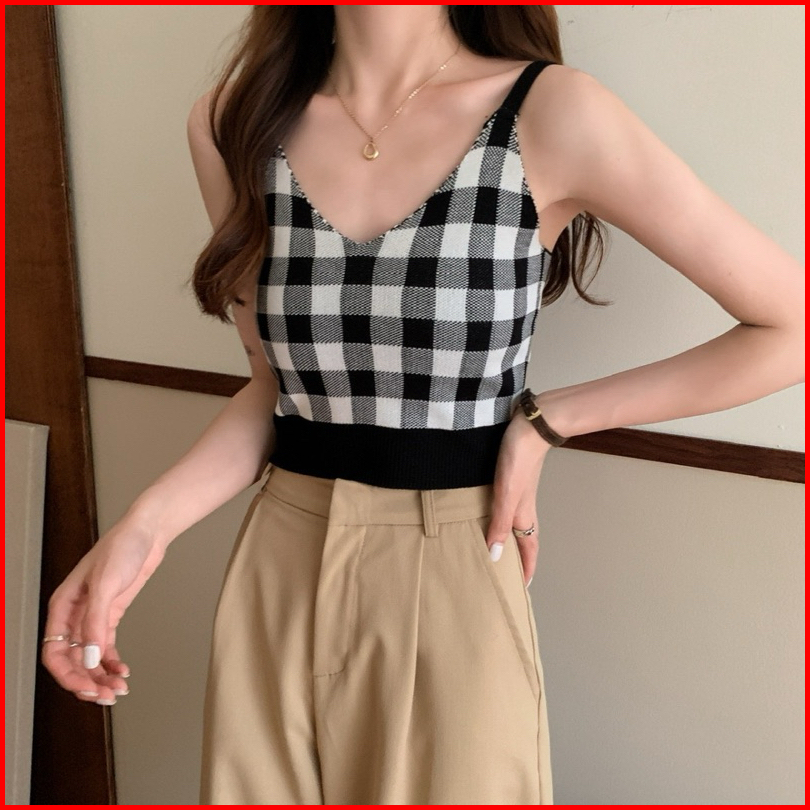 Tanktop V-neck Motif Kotak Kotak Elagan Dan Mewah T292 Tanktop Wanita Crop Top Bahan Rajut