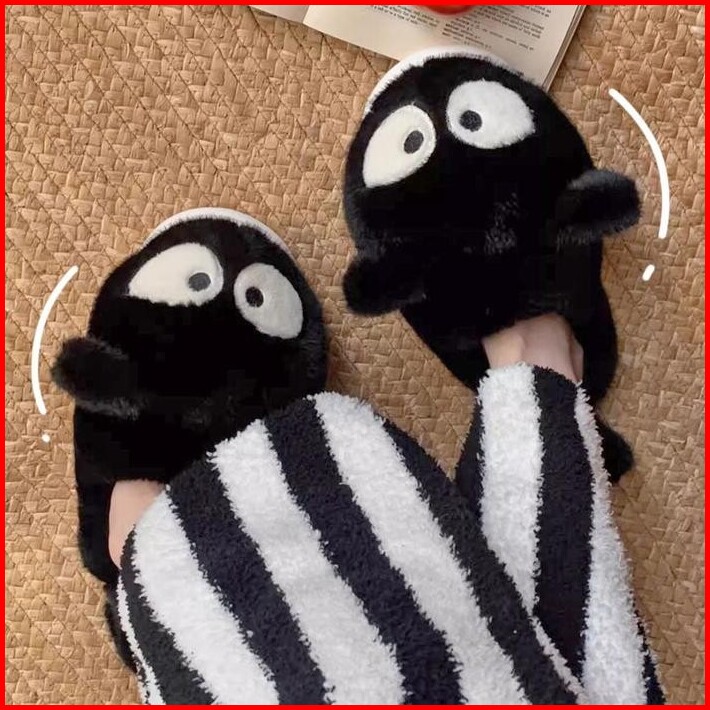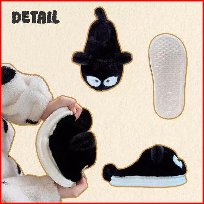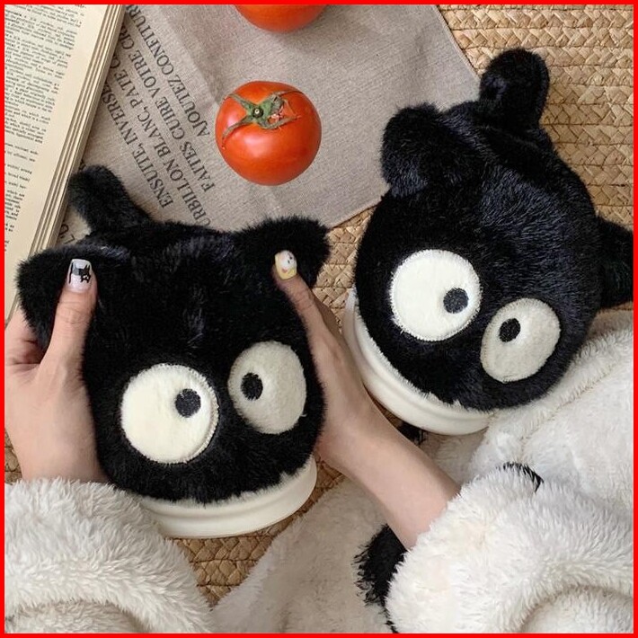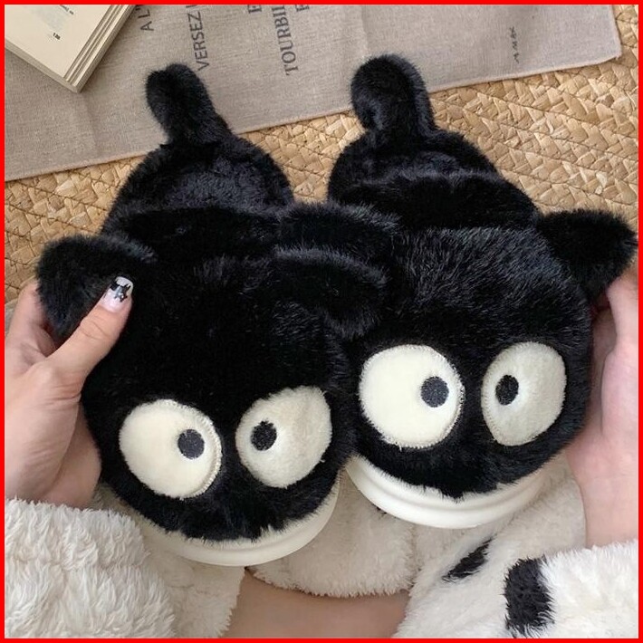 Tokkado Komaru Black Cat Sandal Rumah Premium Bulu Boneka Kamar Wanita Kucing Hitam Lucu