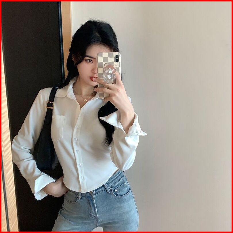 Kemeja Wanita Slim Fit V-neck Gaya Korea Atasan Kemeja Lengan Panjang Pinggang Gaya Terbaru
