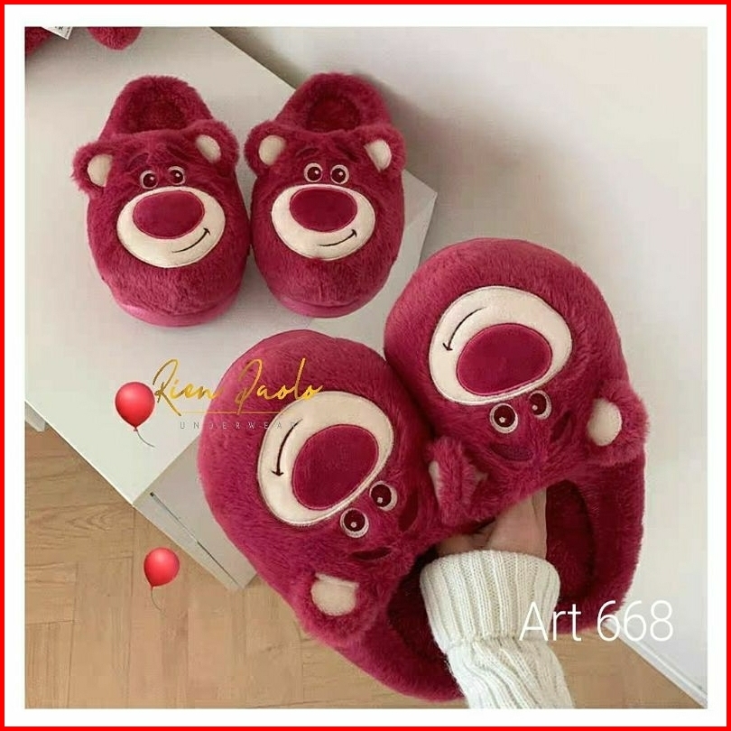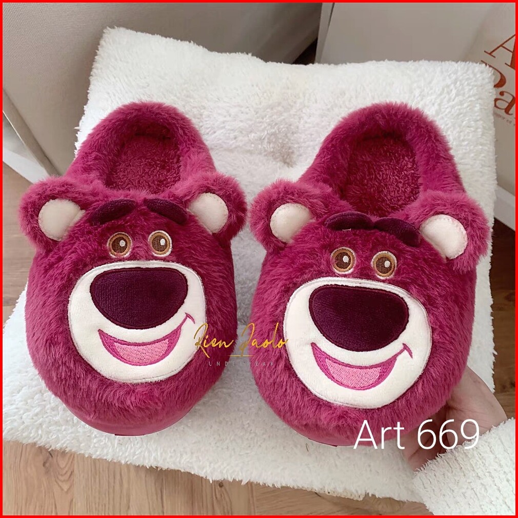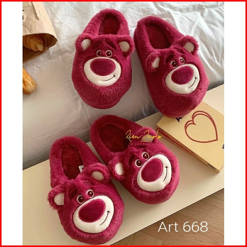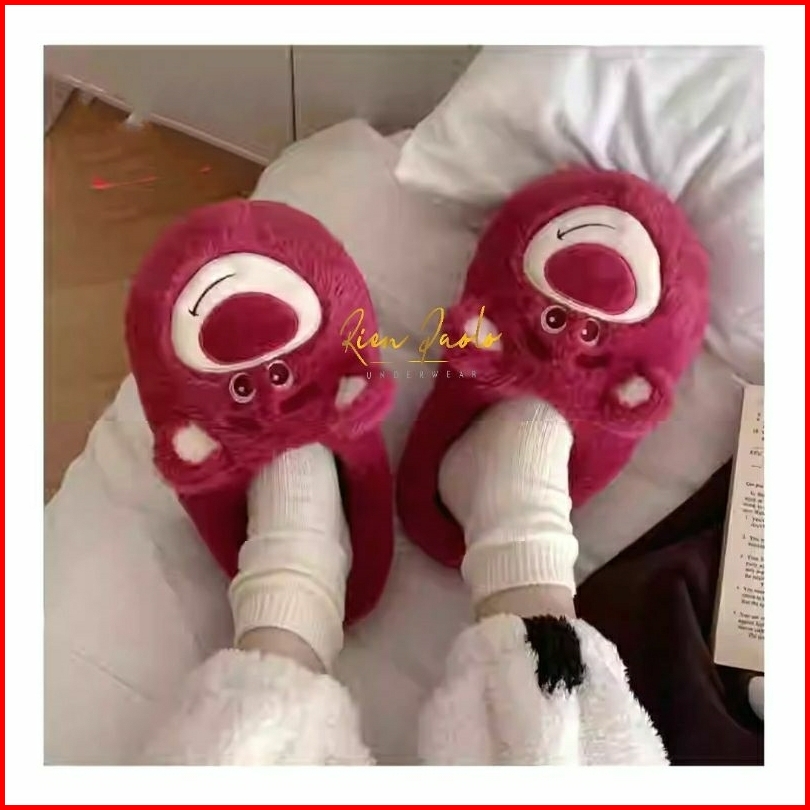 Sandal Bulu Slipper Sendal Kamar Rumah Karakter Lotso Panda Strawberry Bear Doraemon Cute Lucu Tebal Halus Lembut Premiu