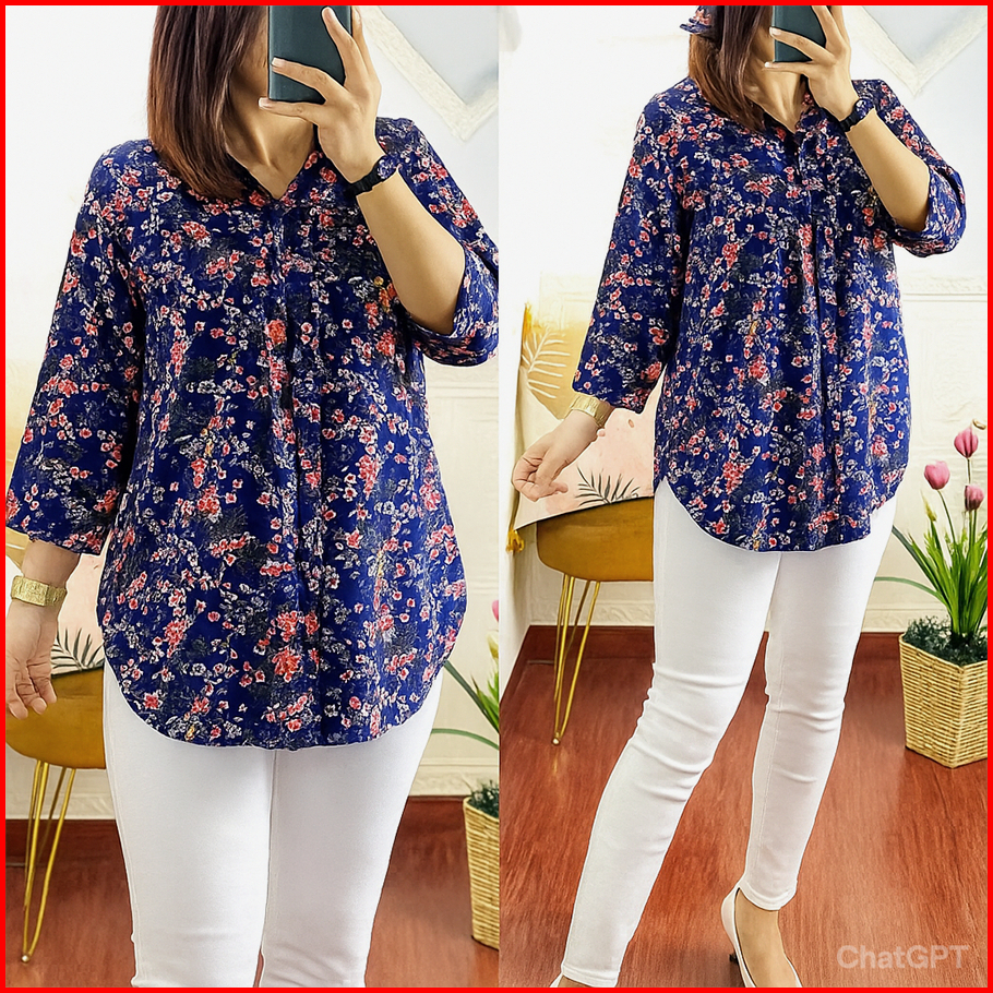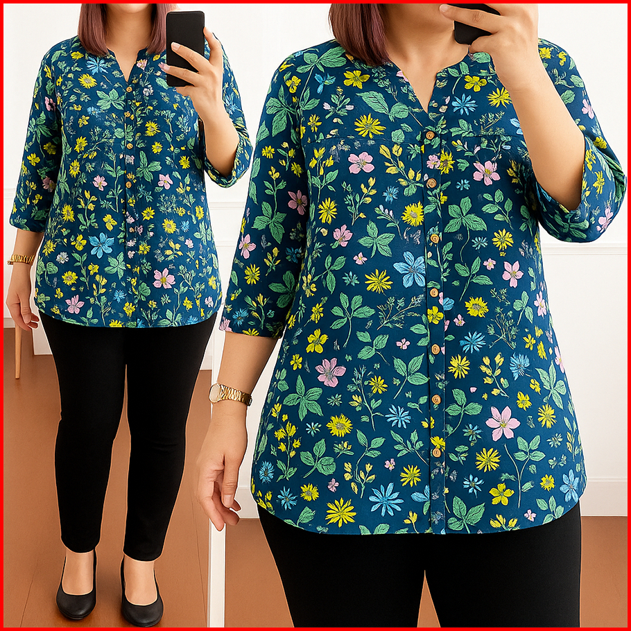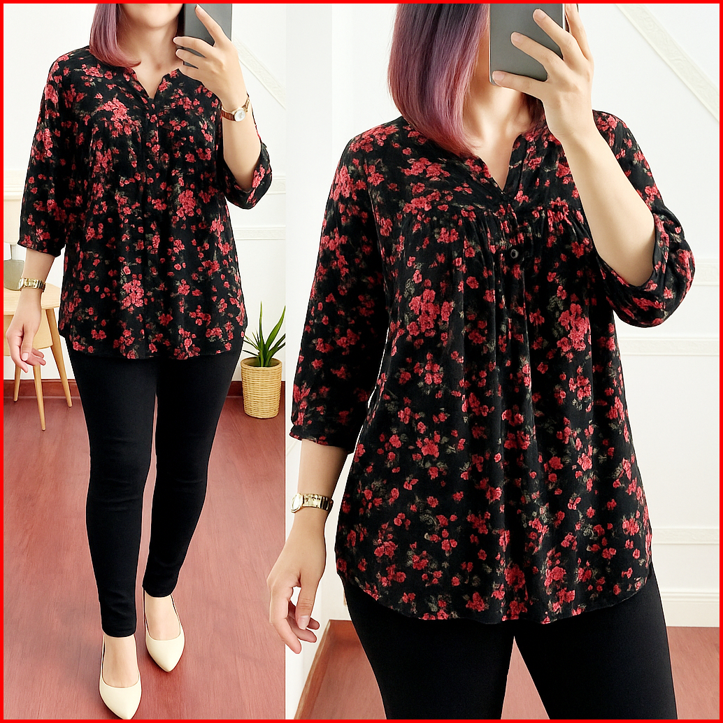 Kemeja Jumbo Wanita Motif Bunga Rayon Lengan 3 4 Model Kekinian Tren Terbaru