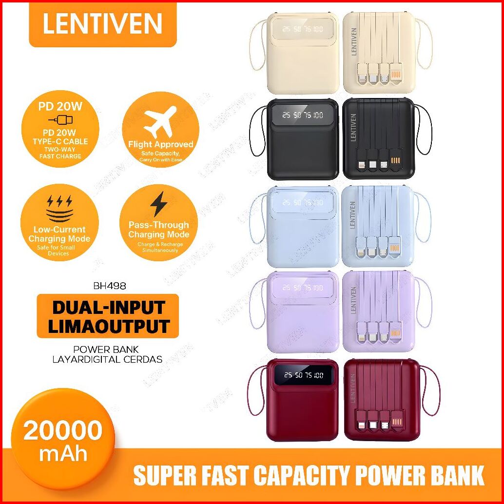 Heycute Lentiven Powerbank 20000mah Mini Size With 4 Kabel Data Fast Charging Dual Output Led Display Bh498