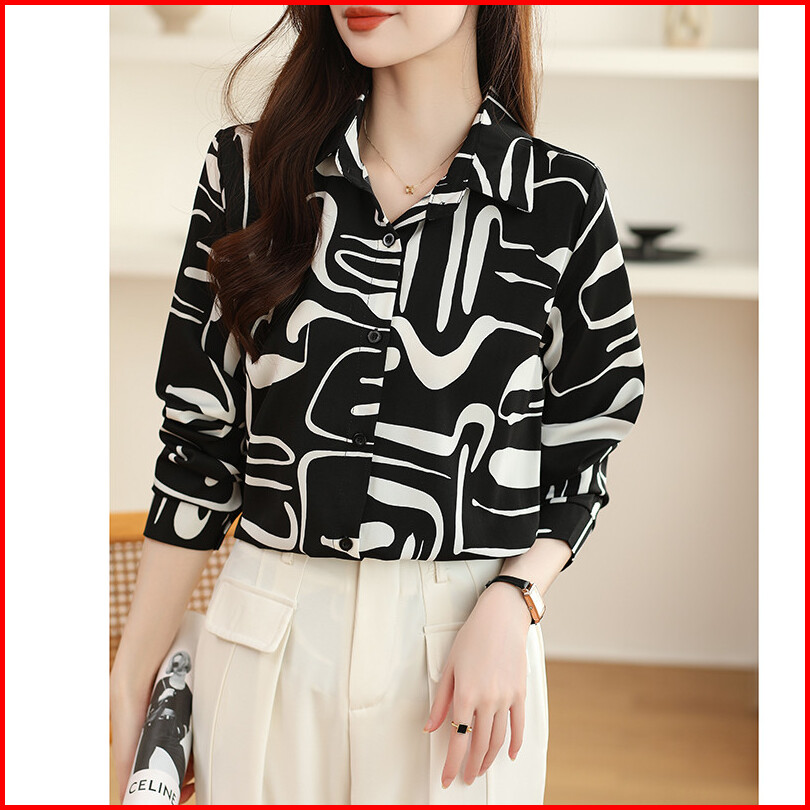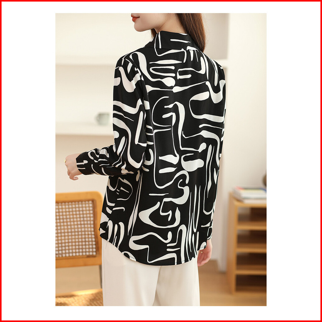Kemeja Hitam Dan Putih Lengan Panjang Kerah Geometris Kasual Wanita Kasual