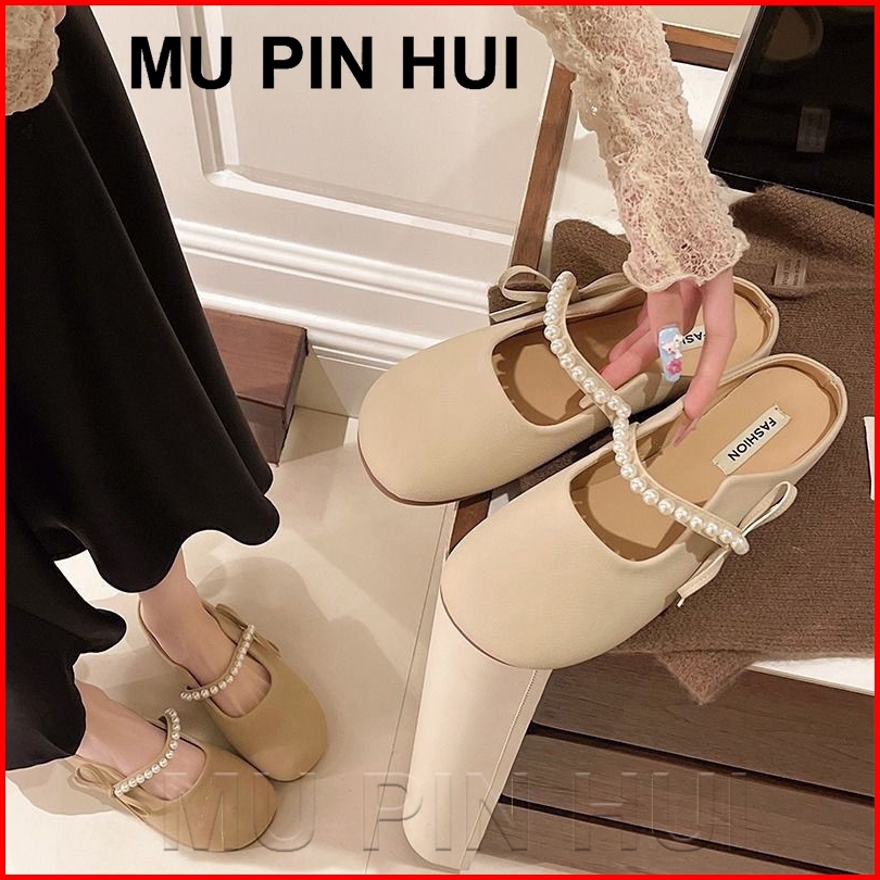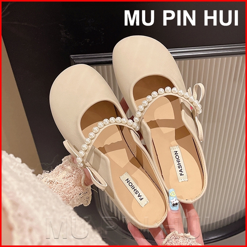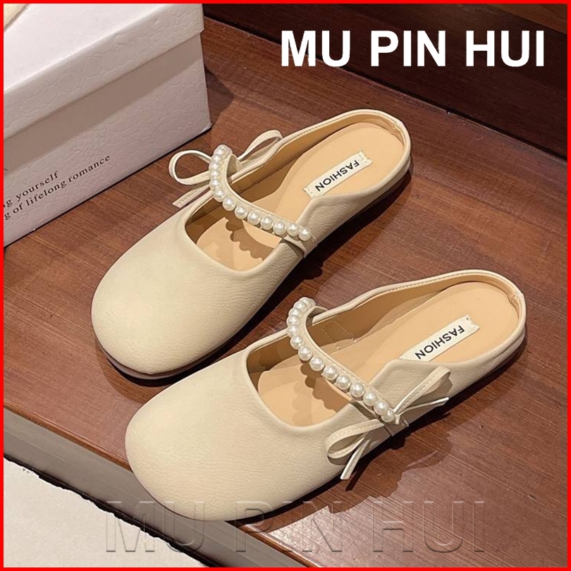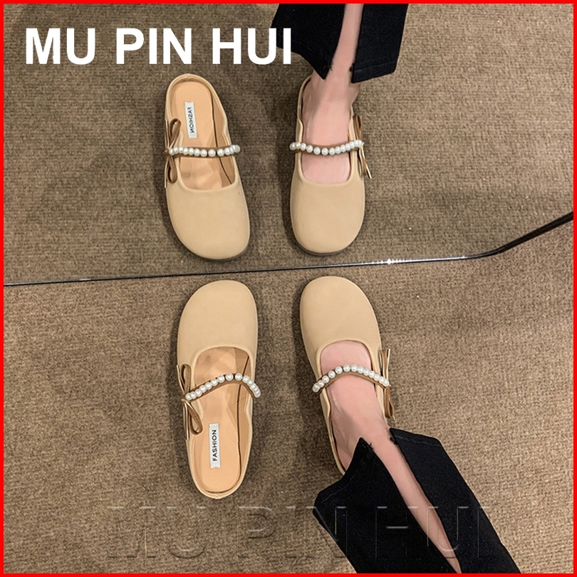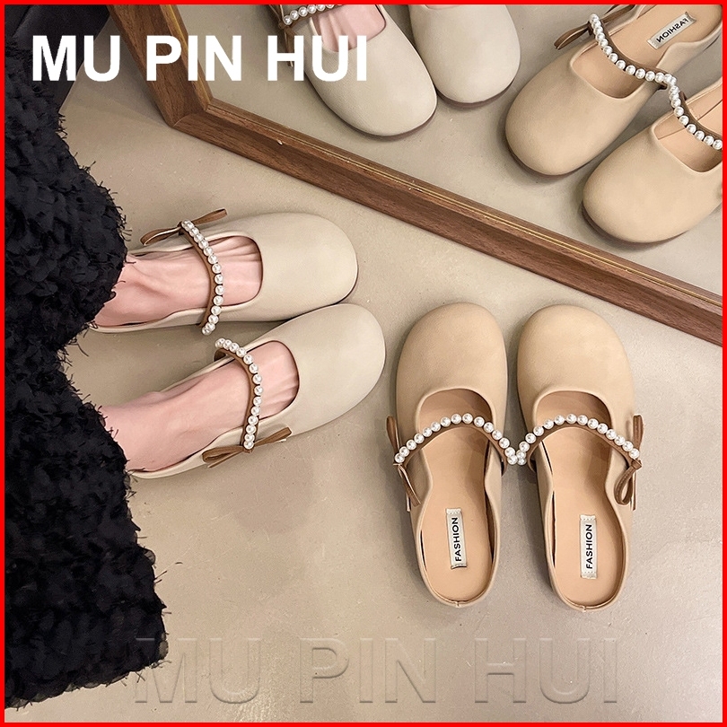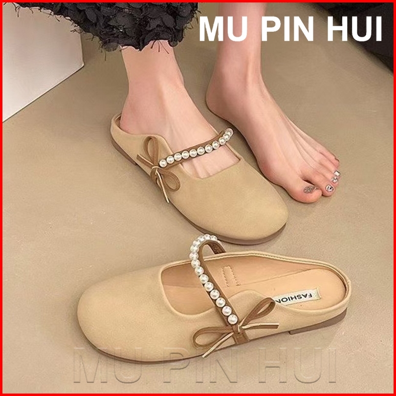 Mu Pin Hui Sandal Wanita Perancis Mutiara Kepala Bulat Sandal Dingin Datar Bottom Sepatu Balet Terbaru
