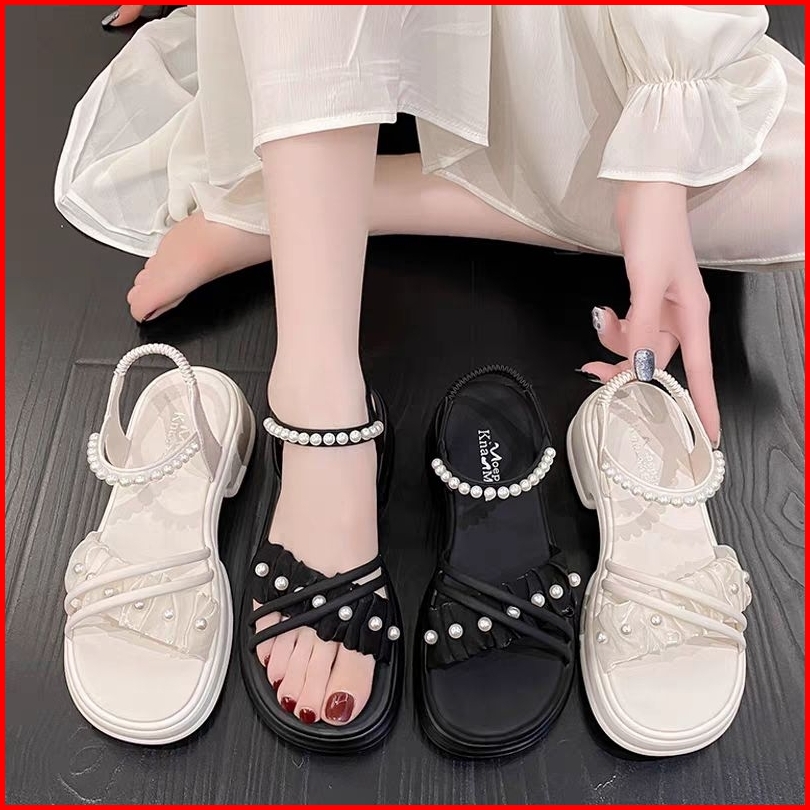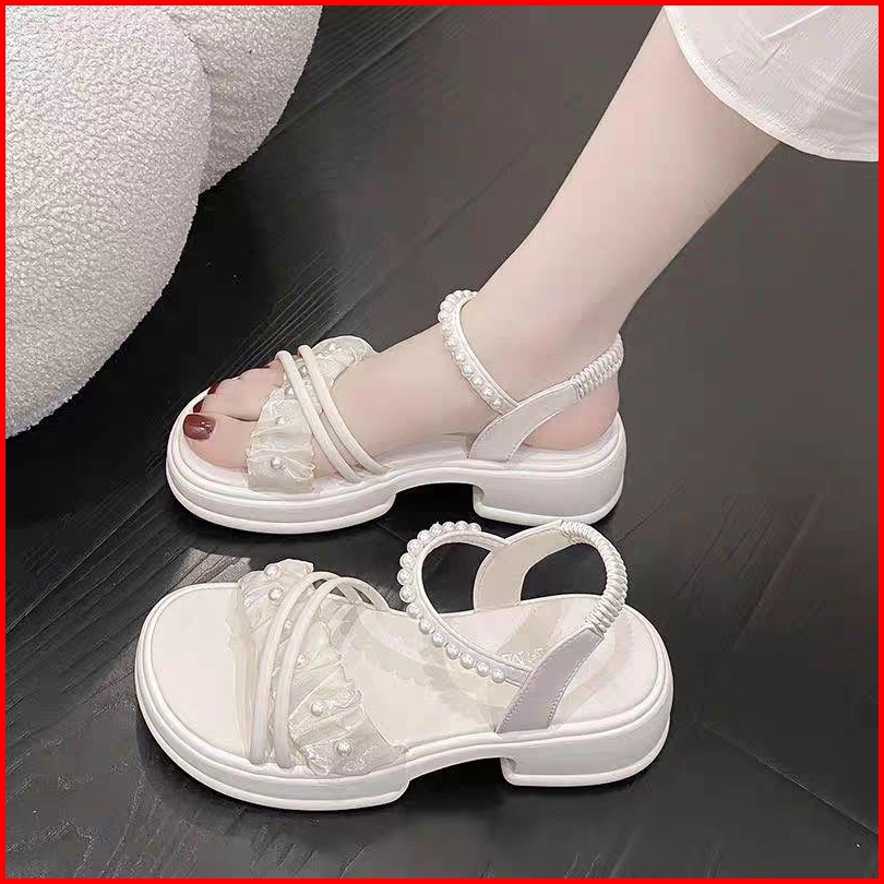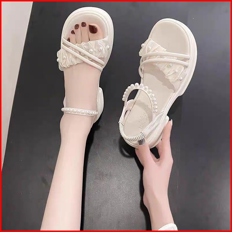 Sepatu Sandal Hak Tingi 5cm Sandal Wanita Kekinian Wedges Sandal Mutiara Tali Modis