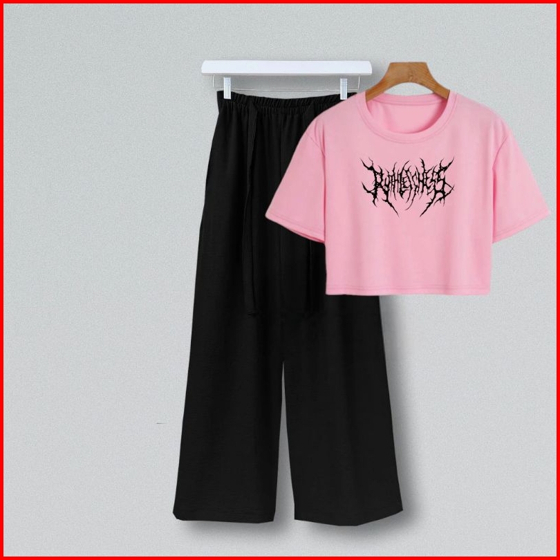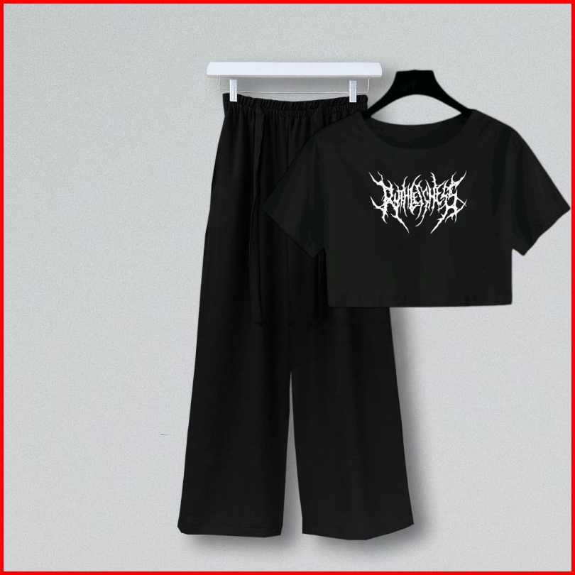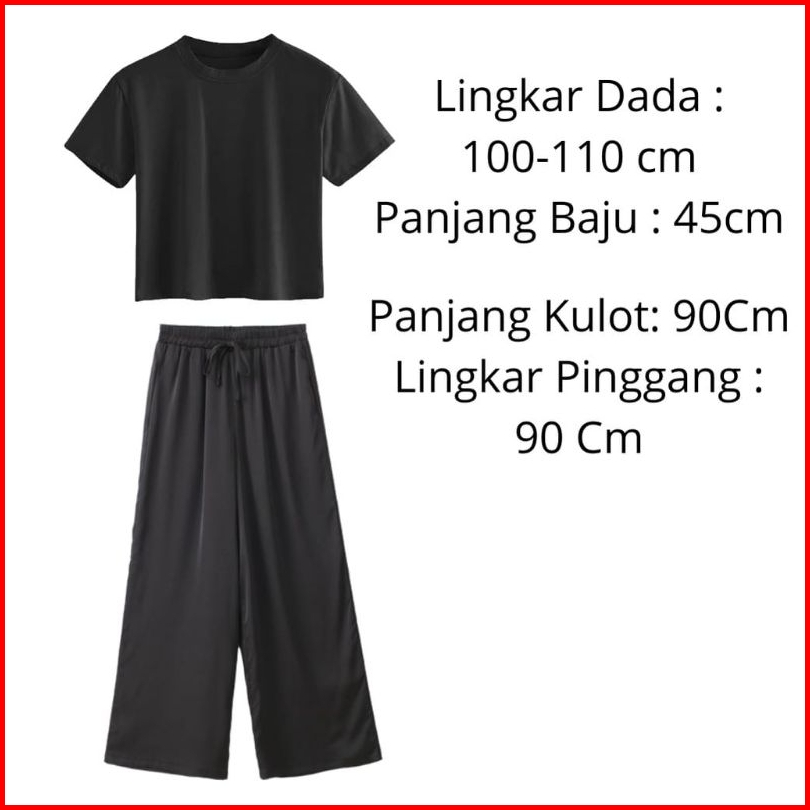 Setelan Wanita Remaja Kaos Crop Top Dan Celana Kulot Hitam Winter Korean Style