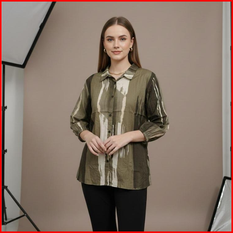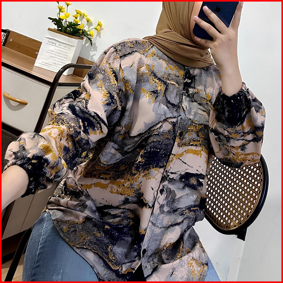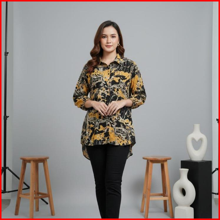 Kemeja Motif Abstrak Wanita Jumbo Lengan Panjang 7 8 Katun Rayon Model Selegram Terbaru