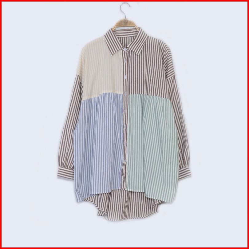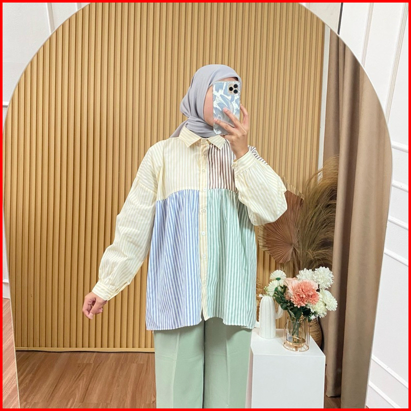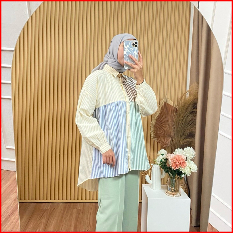 Kara.id Gaia Kemeja Kombinasi Stripe - Atasan Oversize Wanita - Kemeja Salur Katun Lengan Panjang