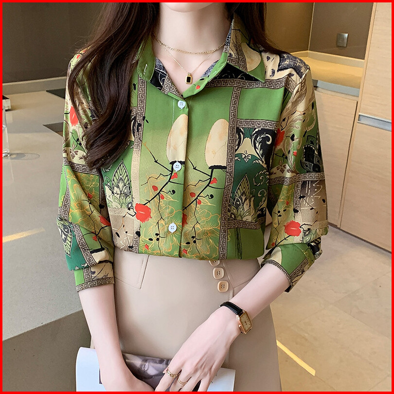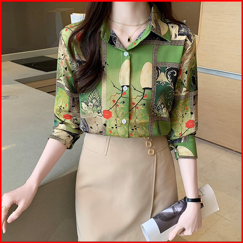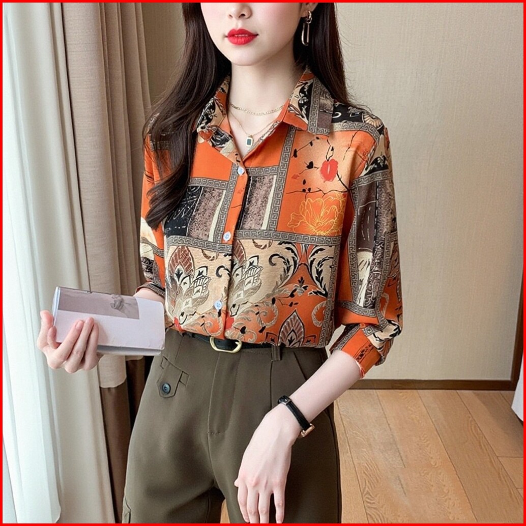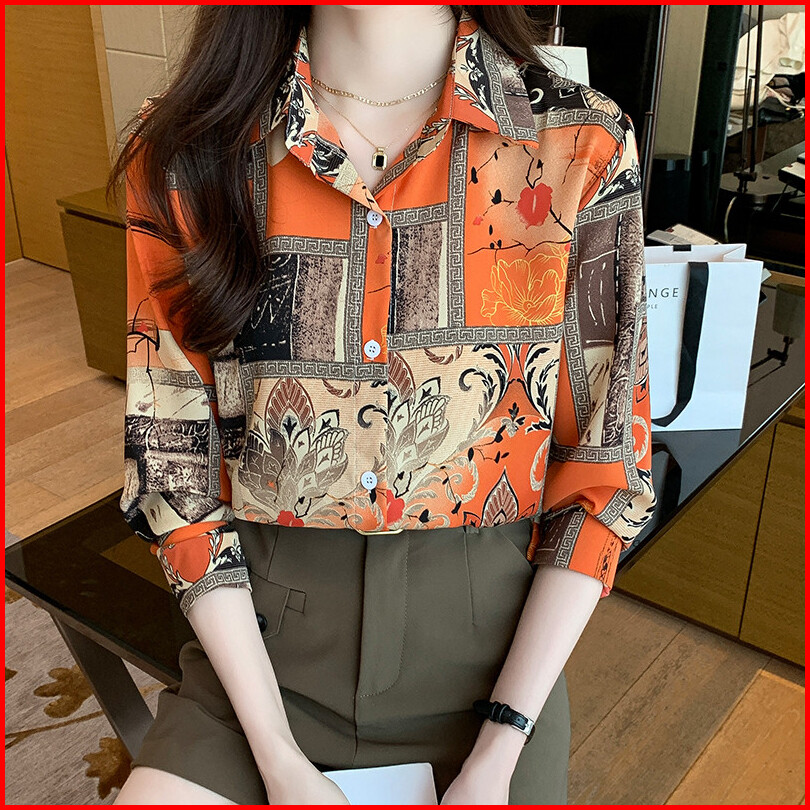 Fashion Korea Kemeja Wanita Sifon Lengan Panjang Oranye Hijau Atasan Kerja Kasual Pantai Longgar