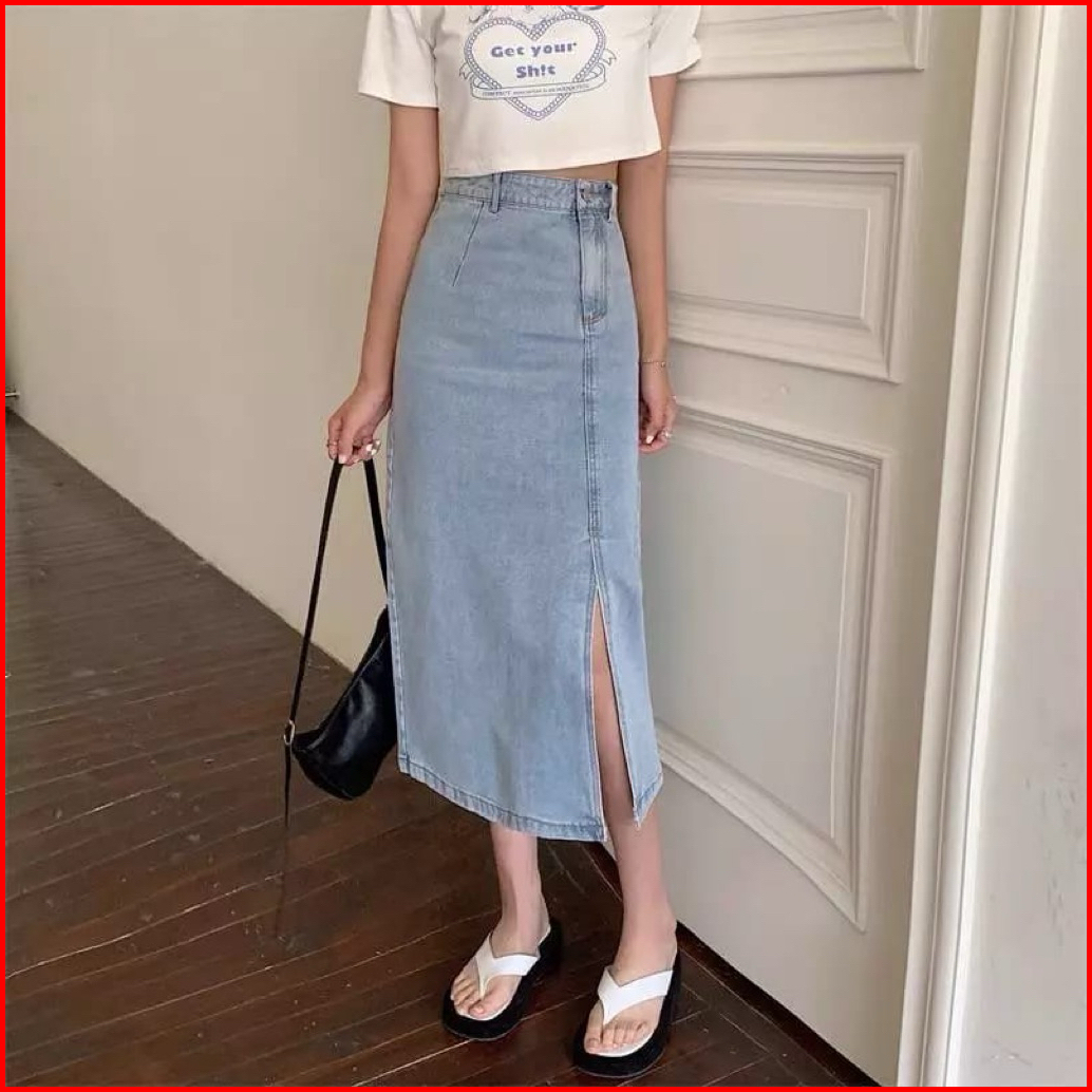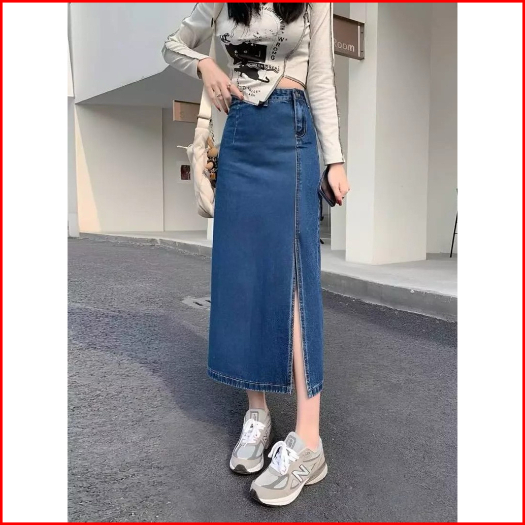 Rok Jeans Panjang Rok Span Korean Style Wanita Jumbo Rok Jeans 7 8 Highwaist Biru Retro Skirt Fashion Wanita Denim Rok M