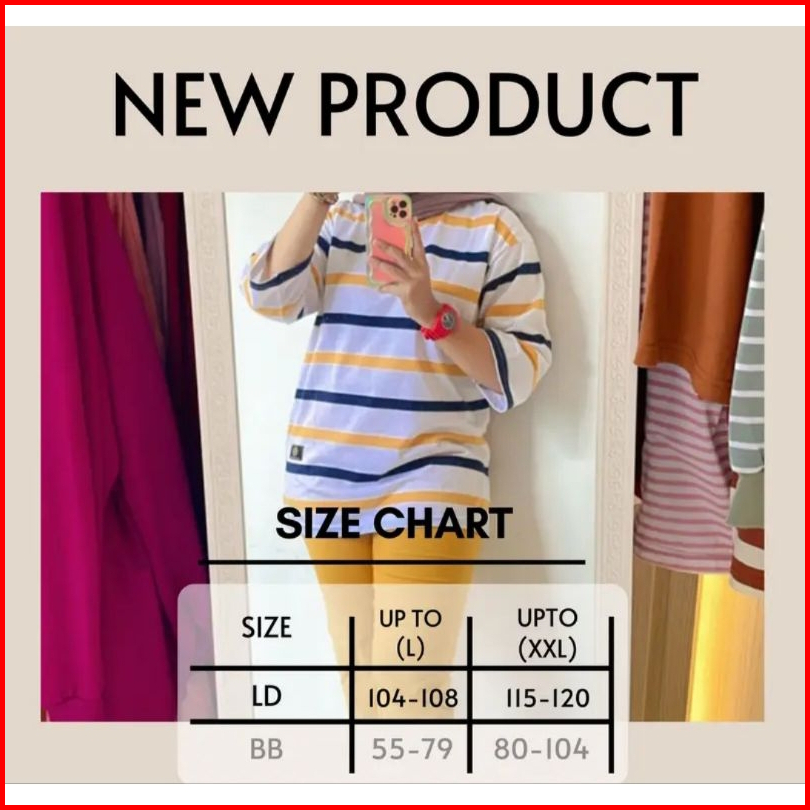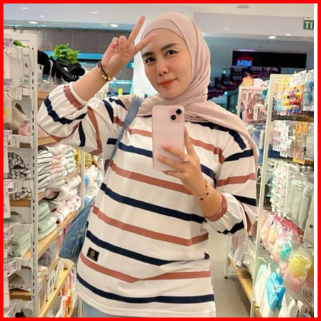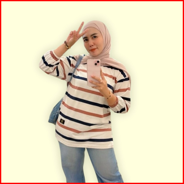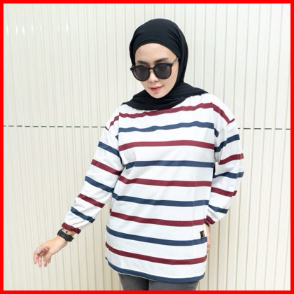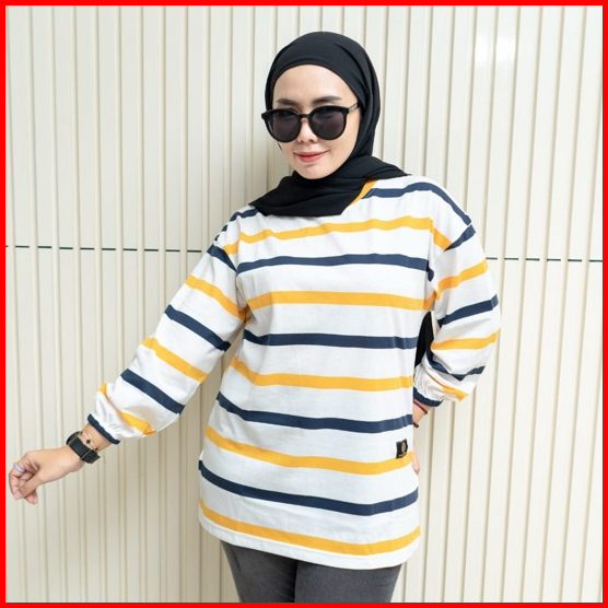 Fst Kaos Oversize Wanita Garis Katun Premium Lengan 7 8 Jumbo T-shirt Oversize Stripe Belang - Belang Salur Kaos Wanita