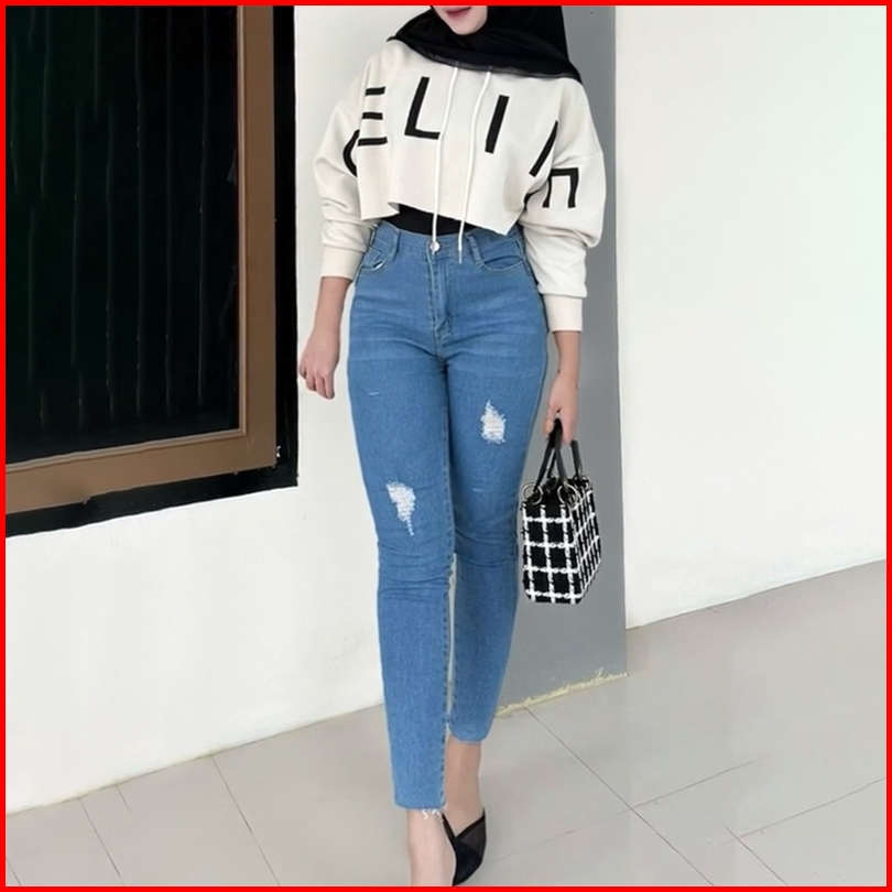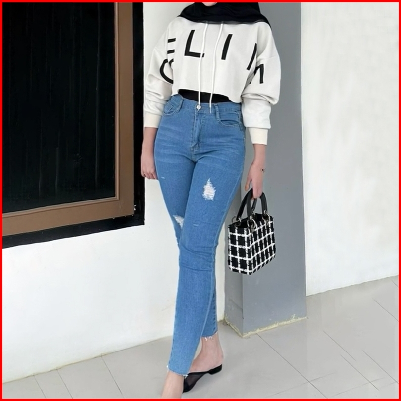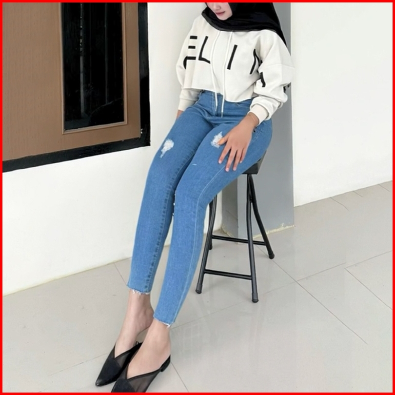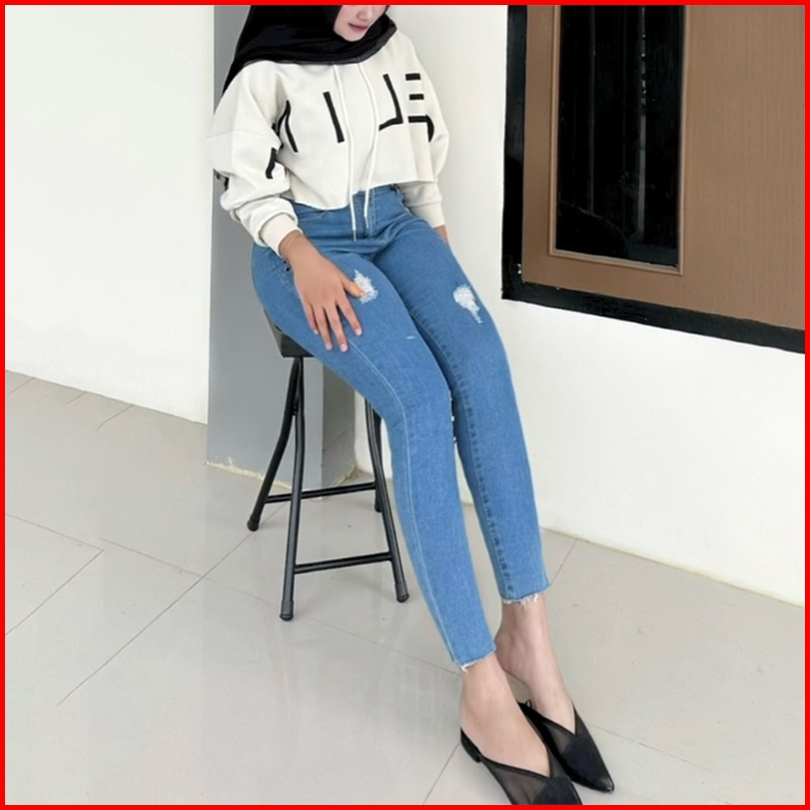 Meetyou 1517 Celana Jeans Sobek Korean Style Celana Panjang Wanita Model Terbaru Skinny Jeans Wanita Fashion Soft Jeans
