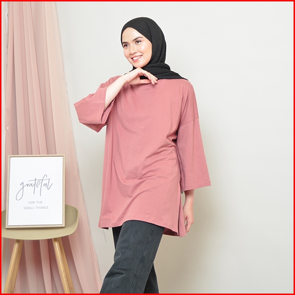 Oversized Basic Top Kaos Polos Oversize Nonbusui Hijab Friendly Lengan 7 8 Tshirt Slits Katun Ziggy
