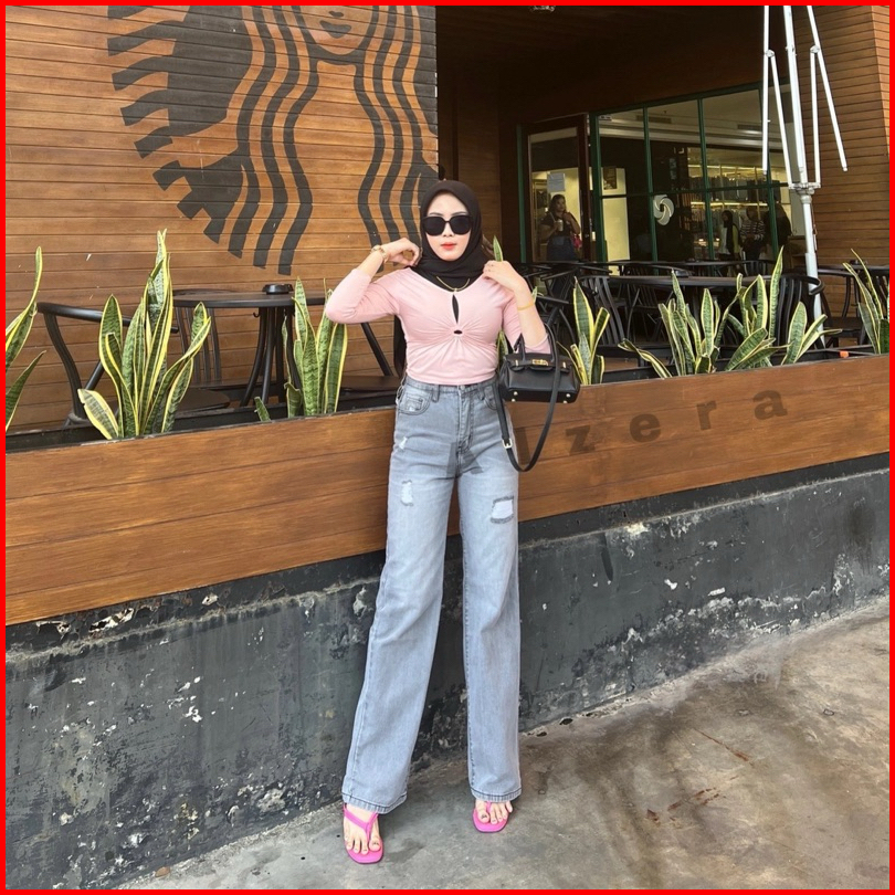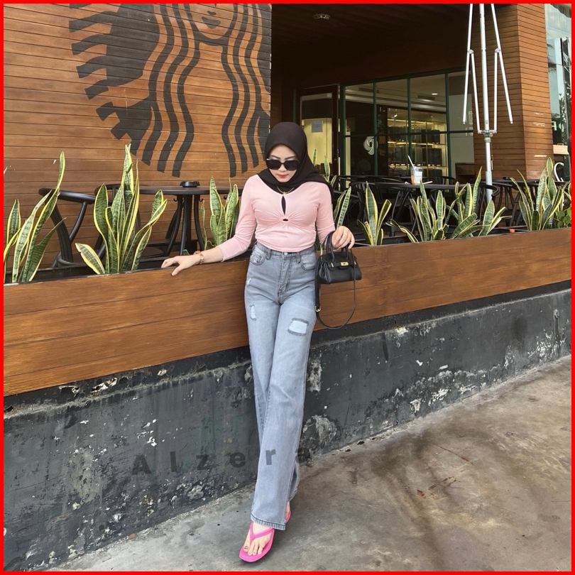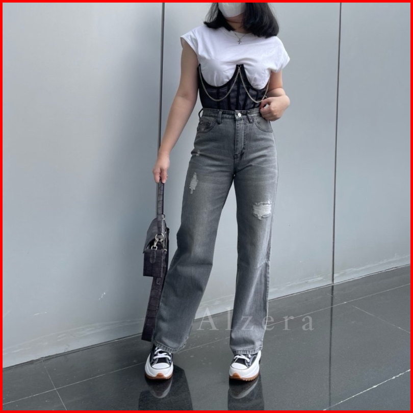 Alzera Highwaist Kulot Grey Ripped Jeans Tidak Tembus Jeans Looser Grey