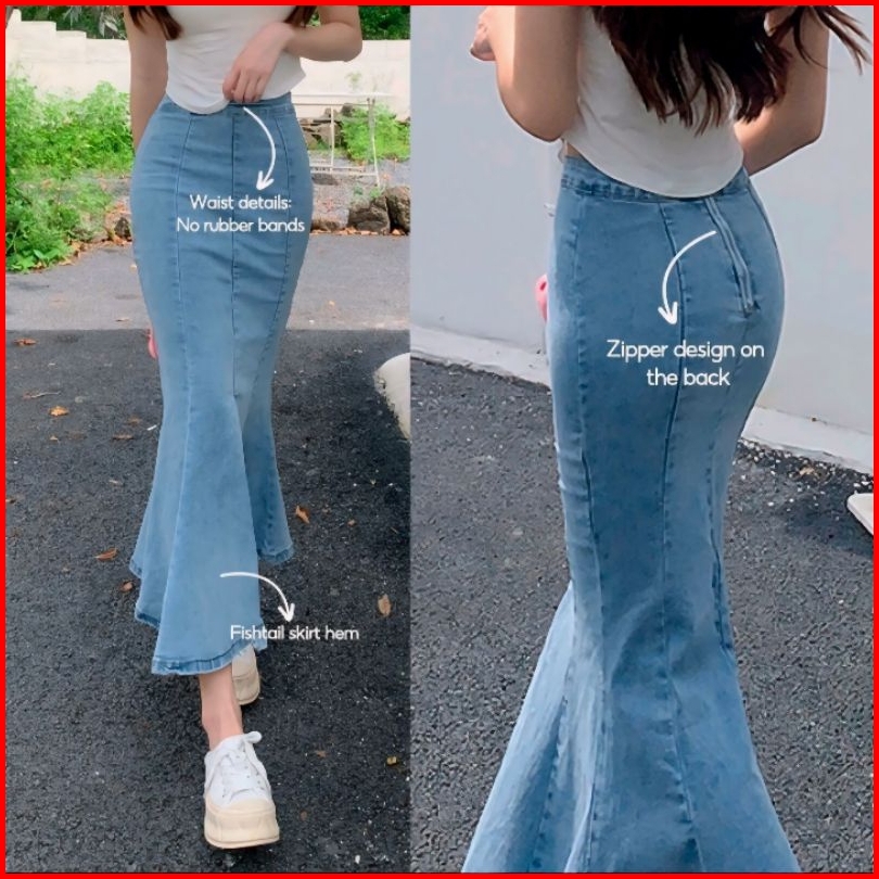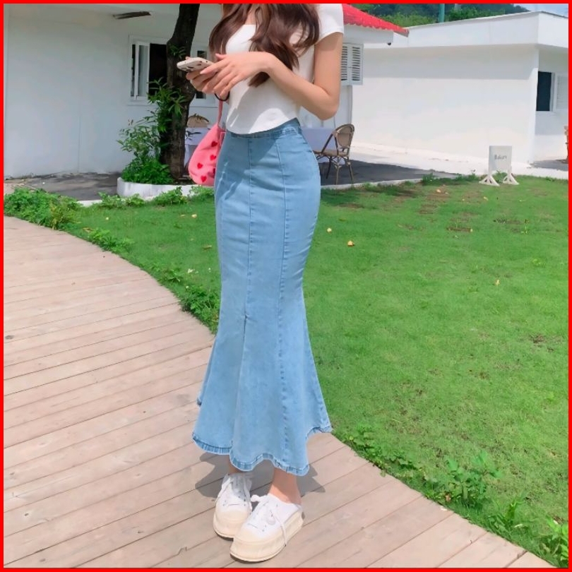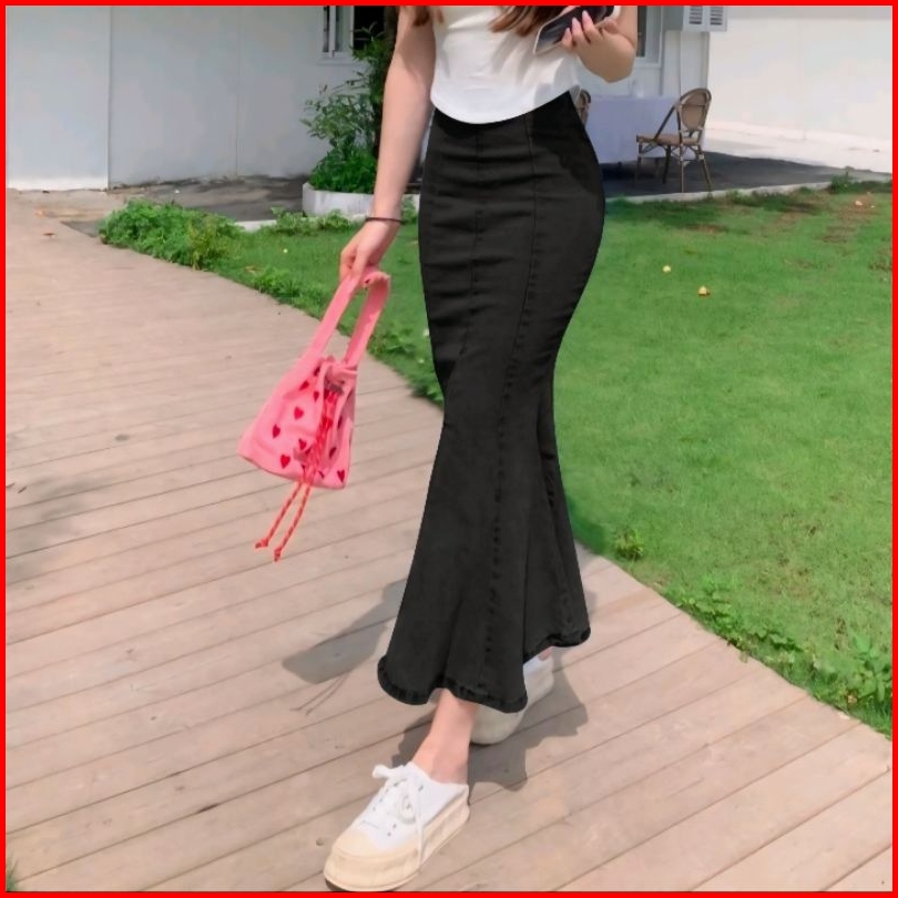 Denim Mermaid Skrit Wanita Hight Waist Slim A-line Elastic Mid-lenghit Hip Skirt Seluler