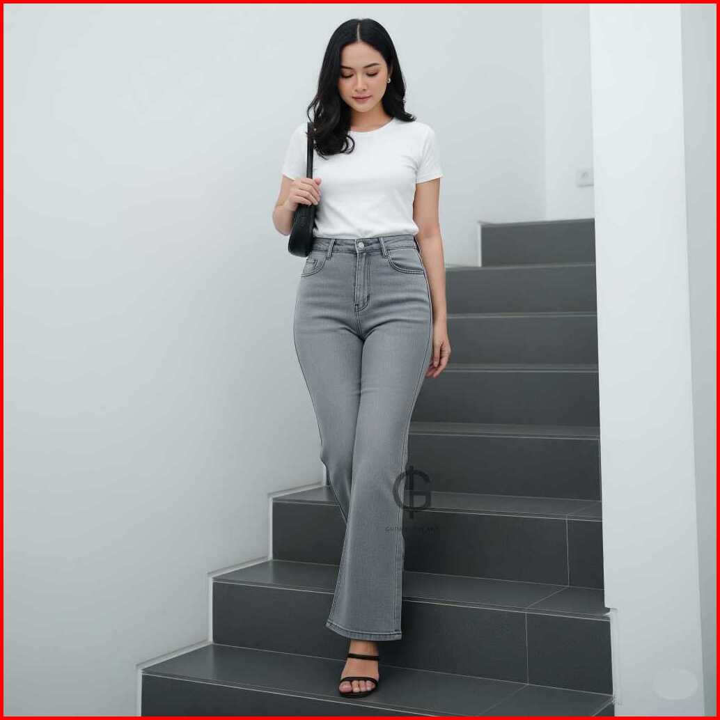 Celana Panjang Tebal Cutbray Jeans Highwaist Melar Wanita Abu Premium Denim