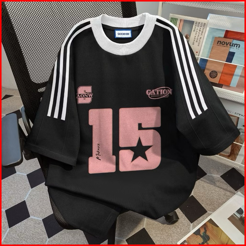 Baju Wanita Putih Black Premium Lengan Pendek Oversize Kaos Merah Muda Garis Tiga Boxy Nomor 15