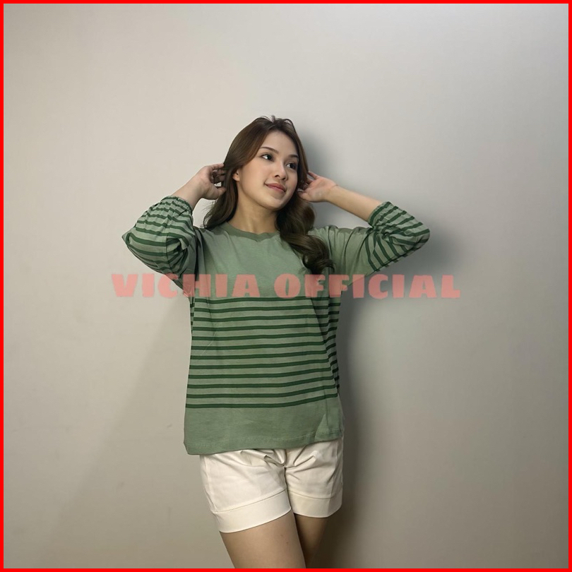 Vichia Baju Wanita Lengan Panjang Blouse Balon Salur Warna Bahan Cotton Combed