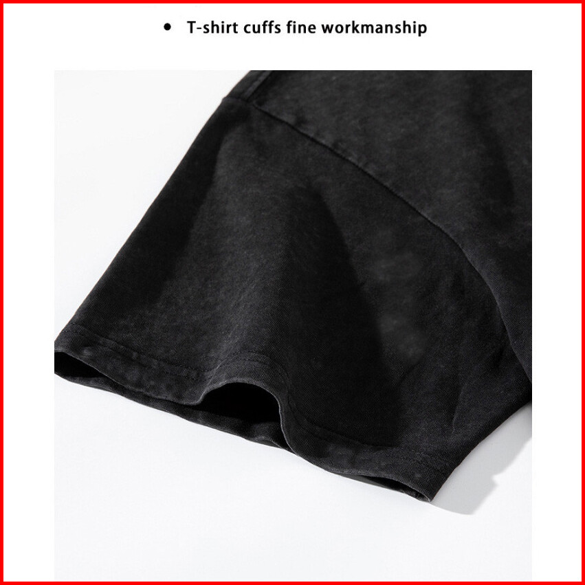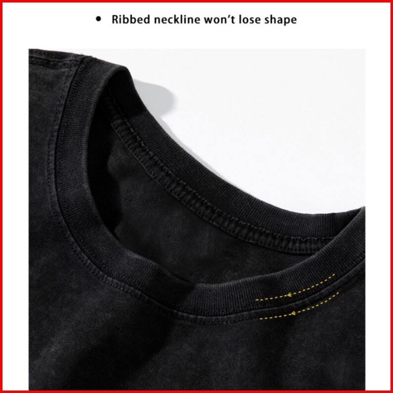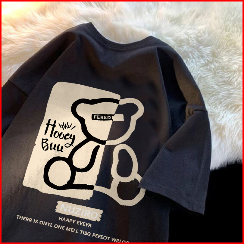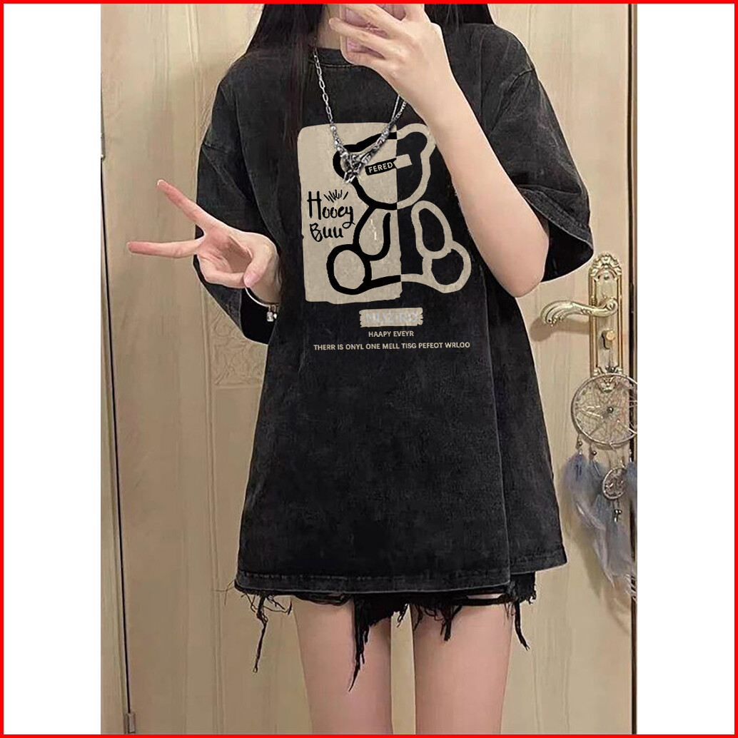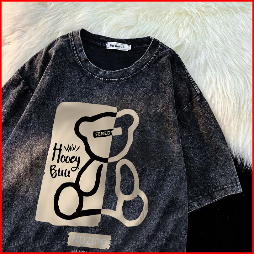 Po Floret Hitam Washed Tshirt Oversize Wanita Retro Style Yellow Bear Print Baju Kaos Wanita Lengan Pendek Katun Murni T