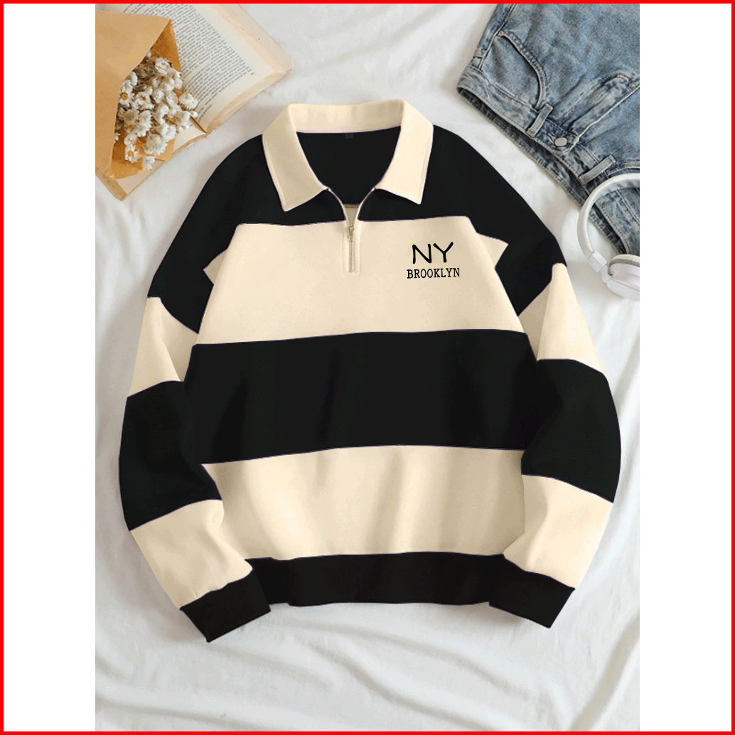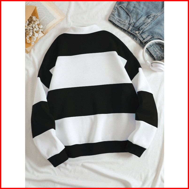 Rugby Sweater Wanita Salur Kombinasi Sweater Kerah Resleting Sweater Halfzip Lengan Panjang Korean Style