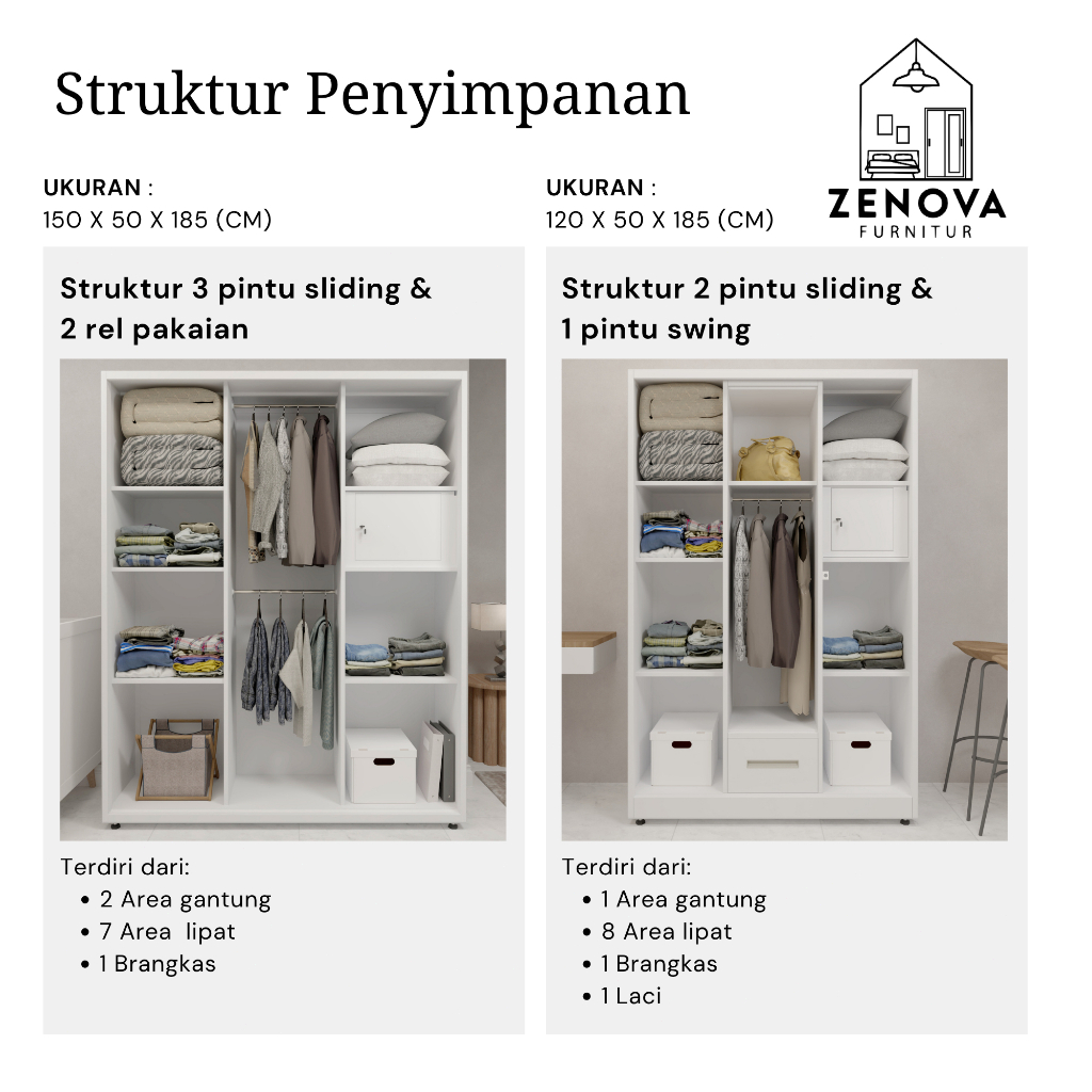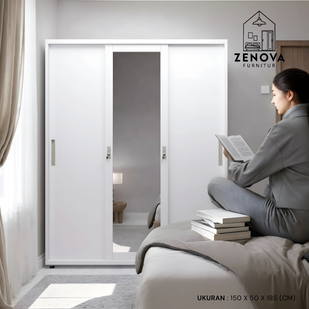 ZENOVA Official Lemari Pakaian Besi Lemari Pakaian 150cm 3 pintu slidding 2 Hanger Cermin Minimalis
