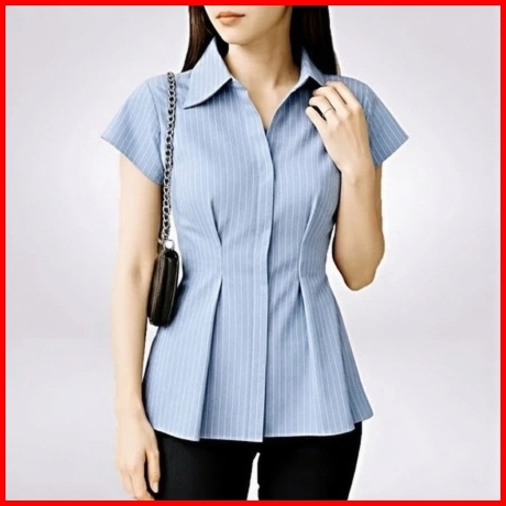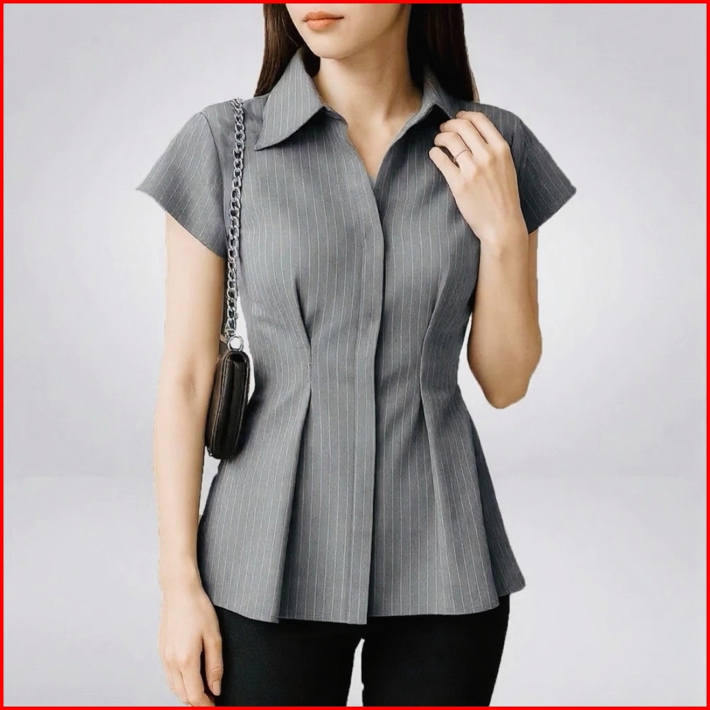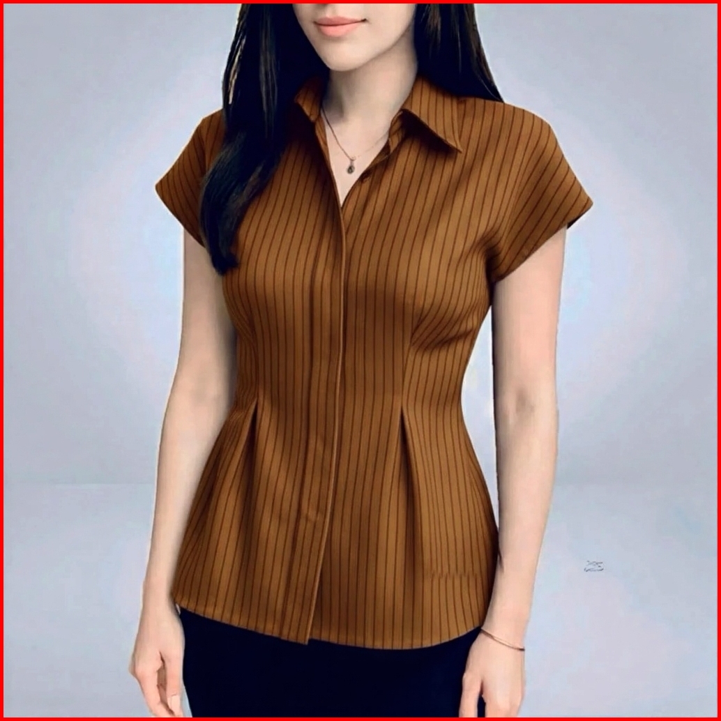 Alba Top - Atasan Wanita Lengan Pendek Slim Fit - Kemeja Wanita Fitted Stripe Salur Basic Casual Bahan Semi Woll - Kemej