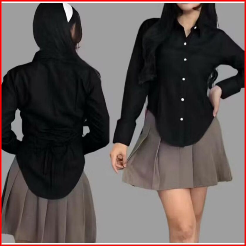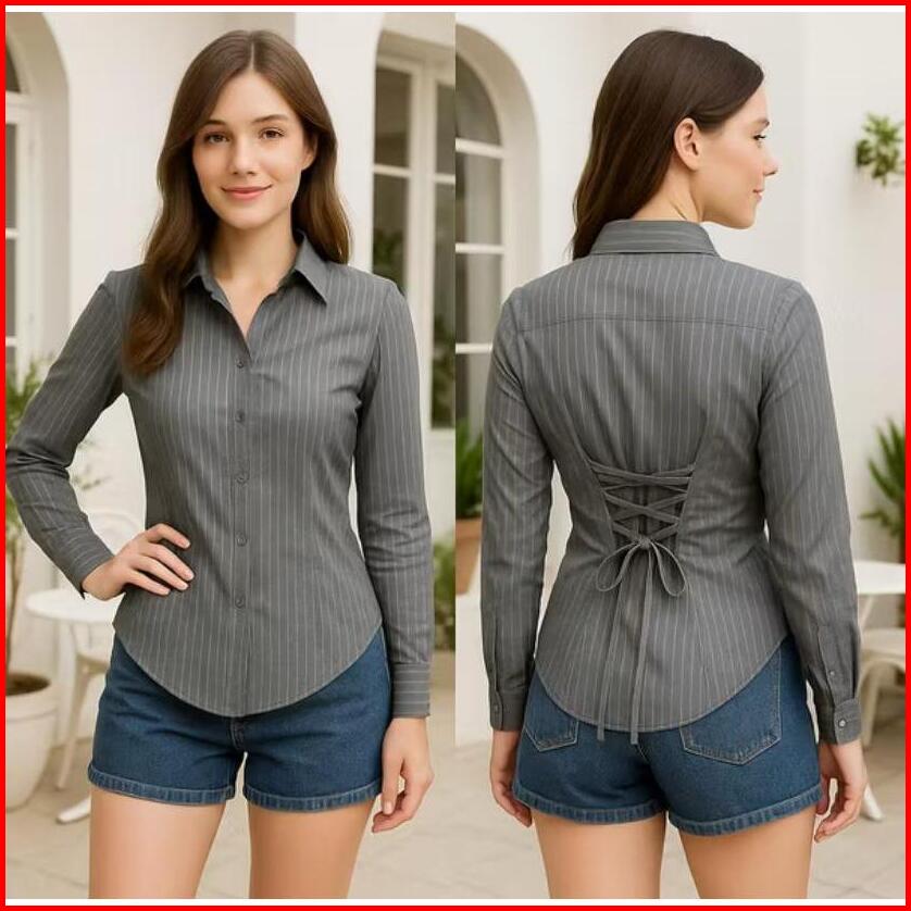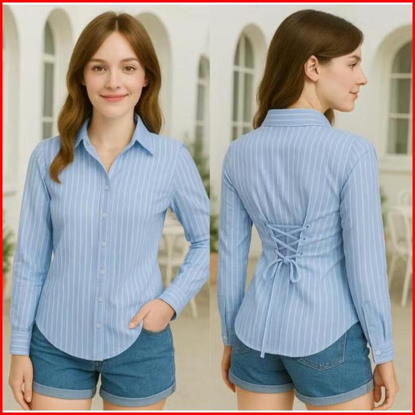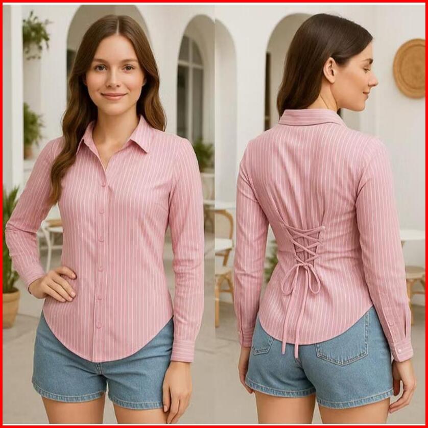 Dea Slim Fitt Shirt Kemeja Crop Tali Belakang Polos Motif Salur